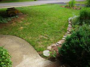 Anne advised me to put in the hardscape first, then look at the plantings. The hardscape she suggested for the front was such a great idea that I’ve already started on it: extend the mulched and planted area under the maple tree out to the drip line, and make a broad path from the sidewalk between there and the existing gardens, which are extended by about two feet. Okay, here, take a look.