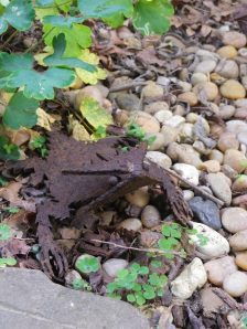 Years ago, when Mom was saddled with a frog fetish (she liked them just fine, but the family went a bit overboard in buying them), I brought her a horned toad from San Antonio. It was living in the front garden, where it could barely be seen. Here it is by the dry creek bed, where it stands out just enough that it’s a nice surprise when you spot it.