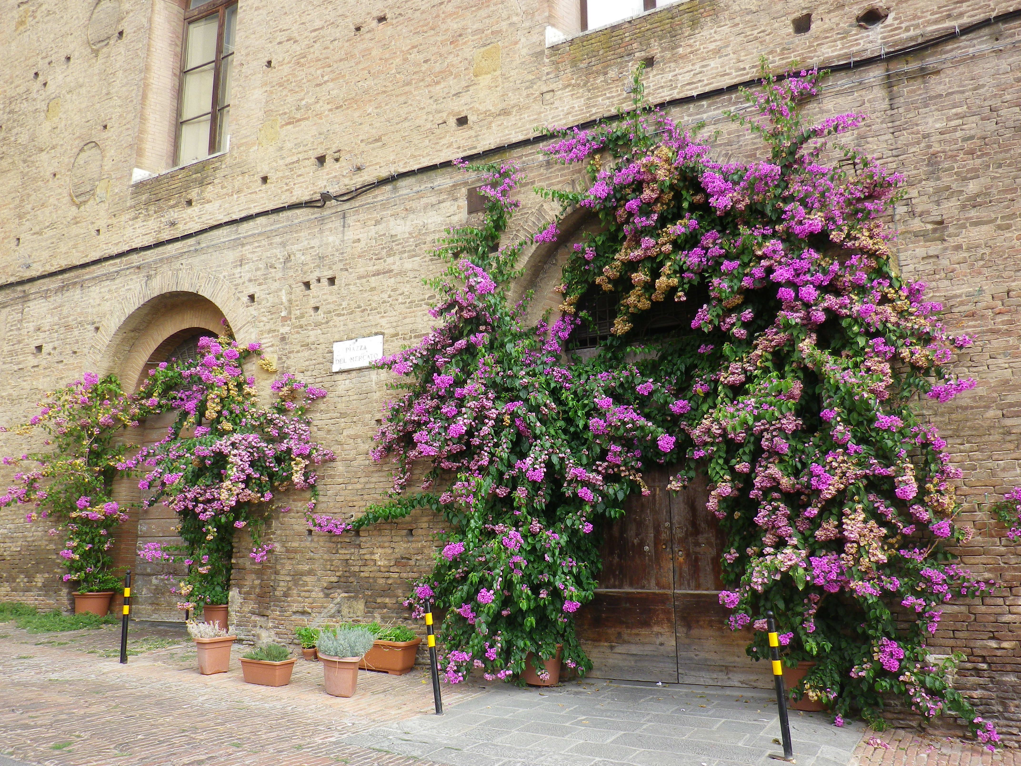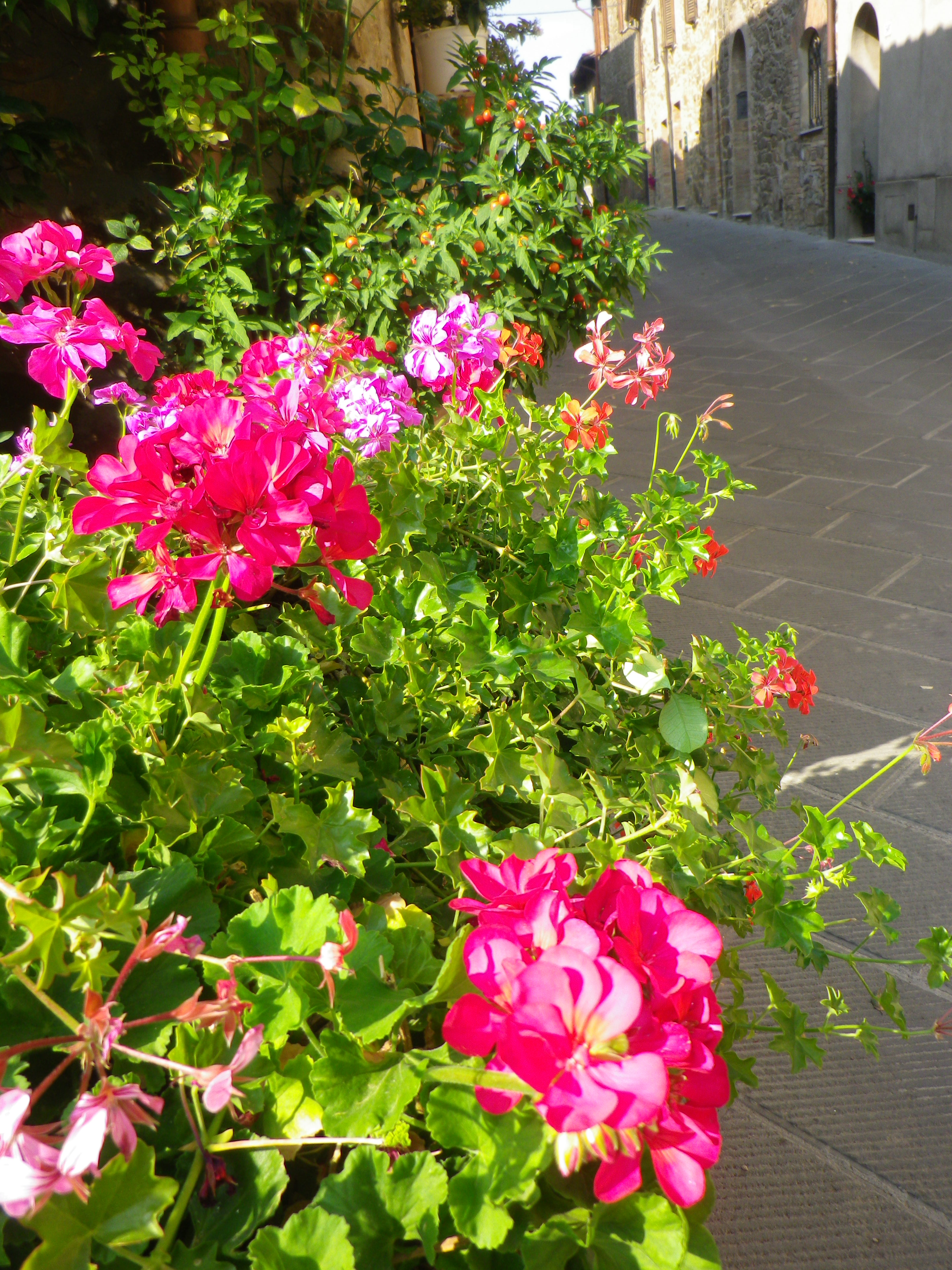 I like this shot of sprawling ivy geraniums against the view of a narrow street in Montalcino.