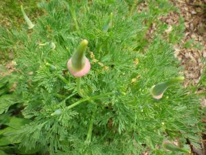 Ya-ya carrots have germinated. Basil is thriving, as is the self-seeded bronze fennel. The tomatoes – cherry red and another one – are just mucking along since I left them in containers for too long and they got parched and wizened. The purple Trionfo Violetto beans and the Round Black radishes from Pinetree Garden Seeds – the latter planted a bit late – are coming up in the whiskey barrel.