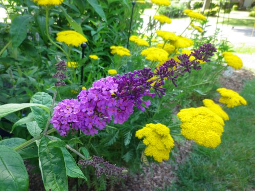 It’s almost as tall as the monstrous helianthus, which I cut back yesterday. Although I do like the way it contrasts with the butterfly bush, which I whacked back in March and which is just now starting to bloom.
