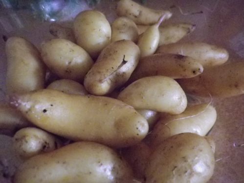 The potatoes – Russian banana fingerling potatoes from John Scheepers – are doing pretty well in the raised bed, despite some sort of fungus or rust or something on the leaves, as you can see from the photo below. The ones in the potato bag were beautiful until they suddenly died.