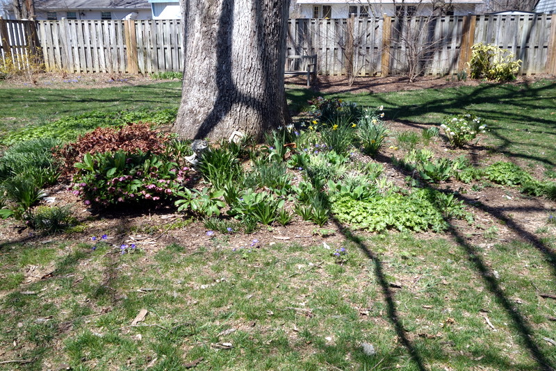 Finally, the oak tree garden is, as always, a delight. The ever-growing sea of winter aconite has turned into fringed leaves by now. As the daffodils start to bloom on the other side of the tree, it’s a reminder that this side could use some, too.