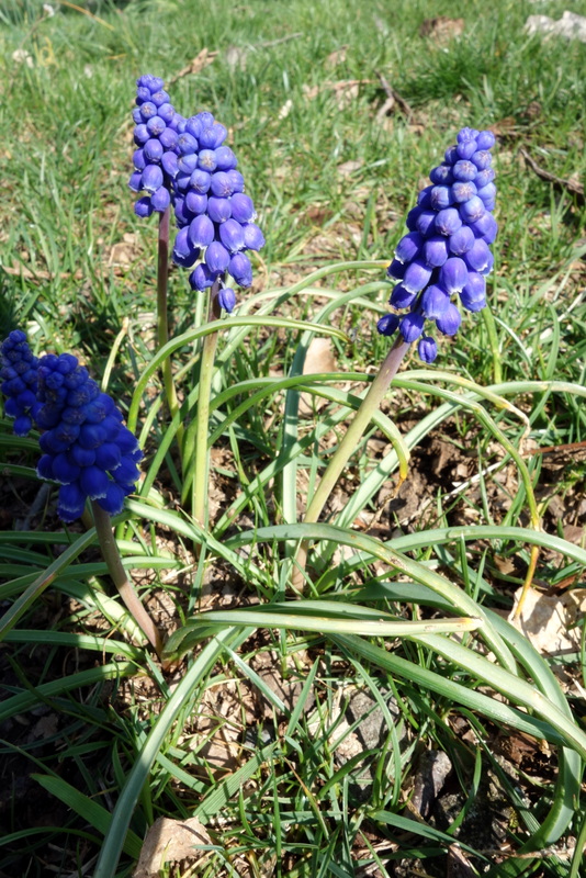 Seeing the brilliant blue of the ordinary grape hyacinth in someone else’s garden reminded me of how lovely they can be, especially en masse. These are some strays near the oak tree.