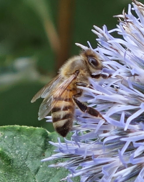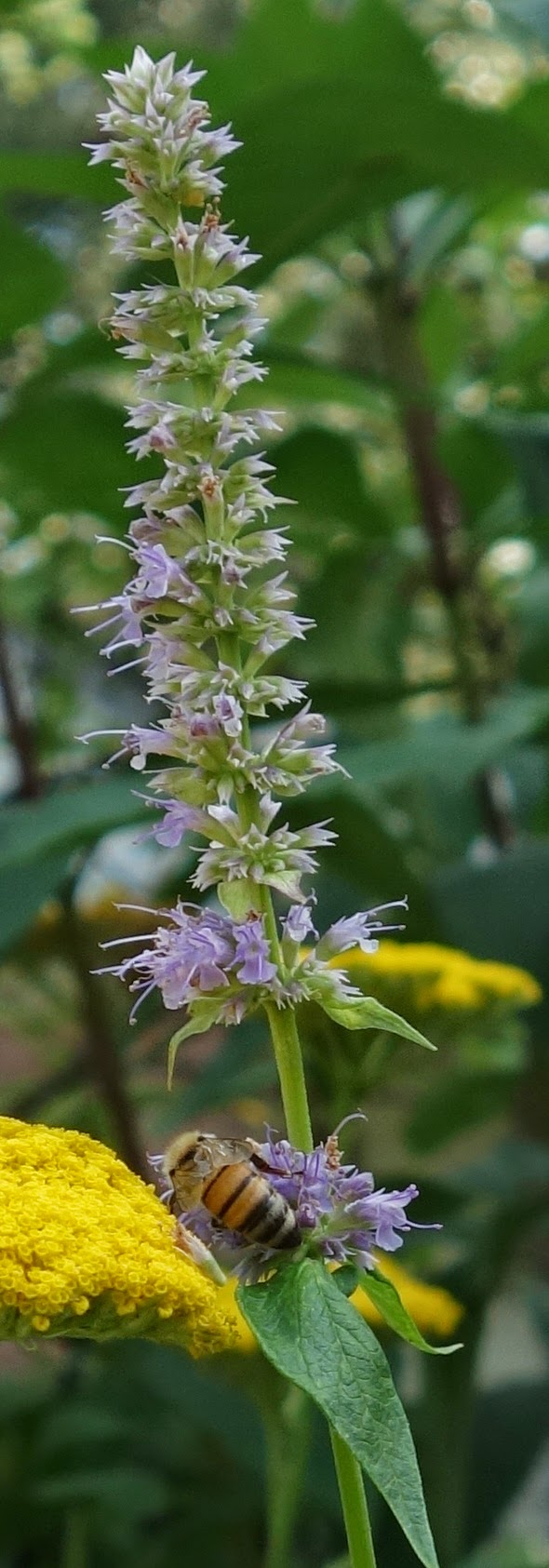 All of this led me back to Douglas Tallamy’s inspiring book, Bringing Nature Home, which I now own in the revised edition. As I was noticing the bees on the hostas, achillea, hyssop, and echinops, I also realized that I never see them on the daylilies (native to Eurasia), or the spirea (though Wikipedia tells me this is a food source for many larvae). What I really want to do is to match my plants with the insects that feed on them, in hopes of identifying more insects. A project for another day.