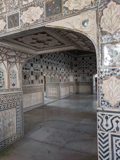 We met our guide who explained the fort to us, though between the noise of the crowds and his strong accent, it was not terribly illuminating. There are three palaces here, winter, summer and monsoon, where the princesses lived. No man was allowed in except for the king. Again, we marvelled at beautiful carvings and painted walls. Inside the palaces were more decorated walls, the winter palace with inserted mirrors to reflect the light on cold winter days. This one featured sparkling inlaid glass in intricate patterns.