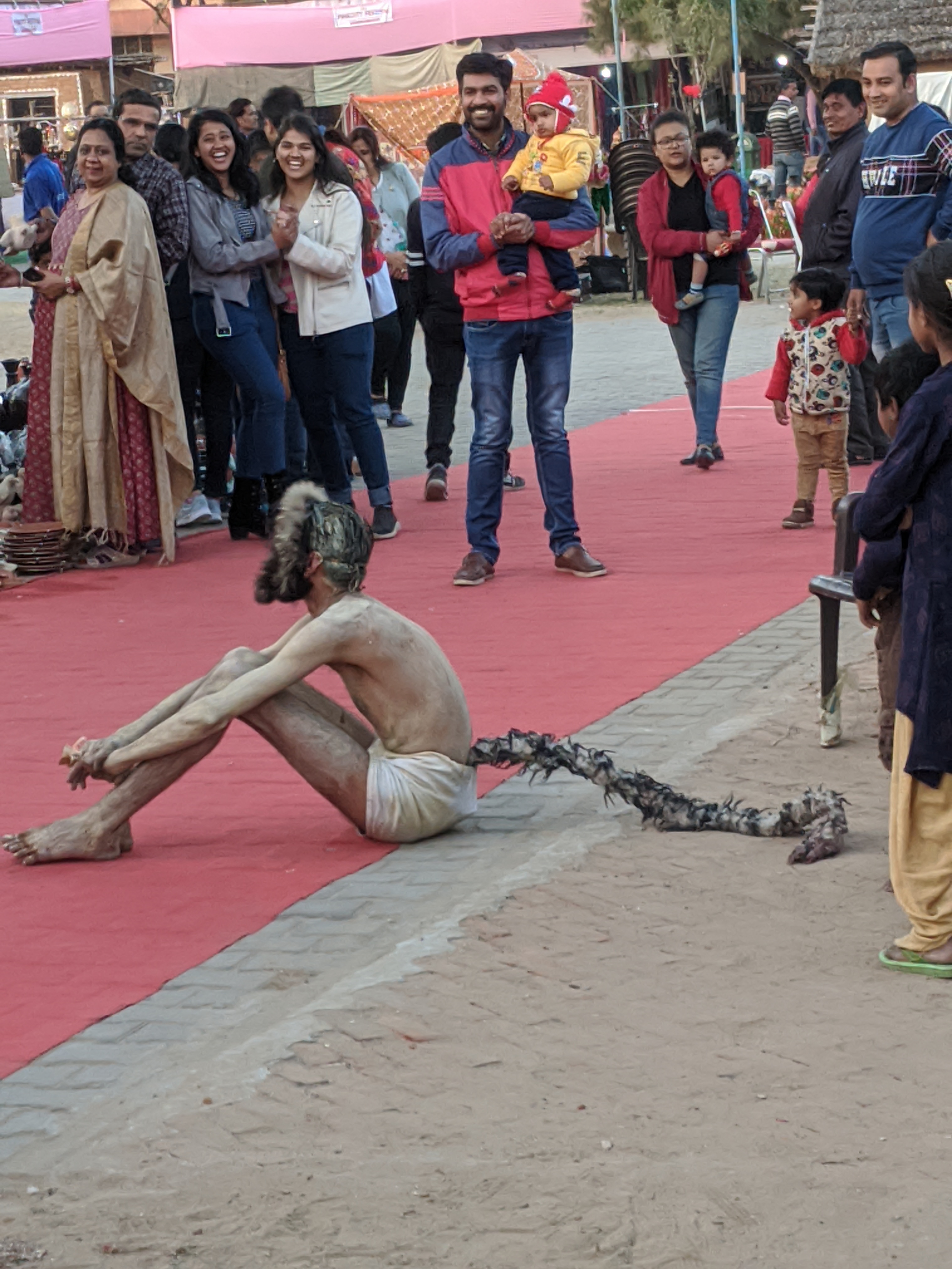 He just looks odd here, and people are certainly laughing, but he was very creepy, and some of the children were really scared of him. He scurried around just like a monkey and tried to steal things from people. I think he must have been a version of Hanuman.