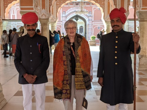 Here is a touristy shot of me at the palace with two of the royal guards. Notice my beautiful scarf, a present from Sujata and Amy on our first evening.