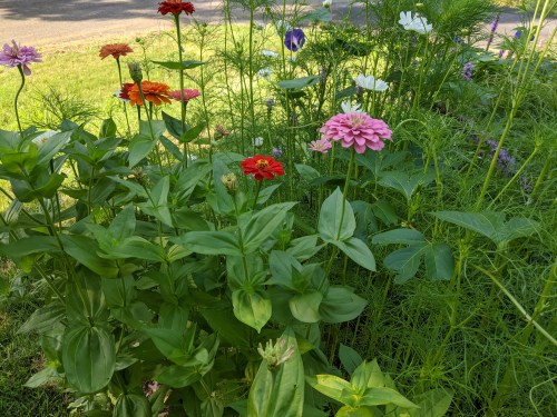I’ve moved the hummingbird feeder so that I can see it from the sewing room window. The hummers love the feeder as well as the zinnias. They don’t seem to mind the scruffiness of this part of the garden.