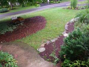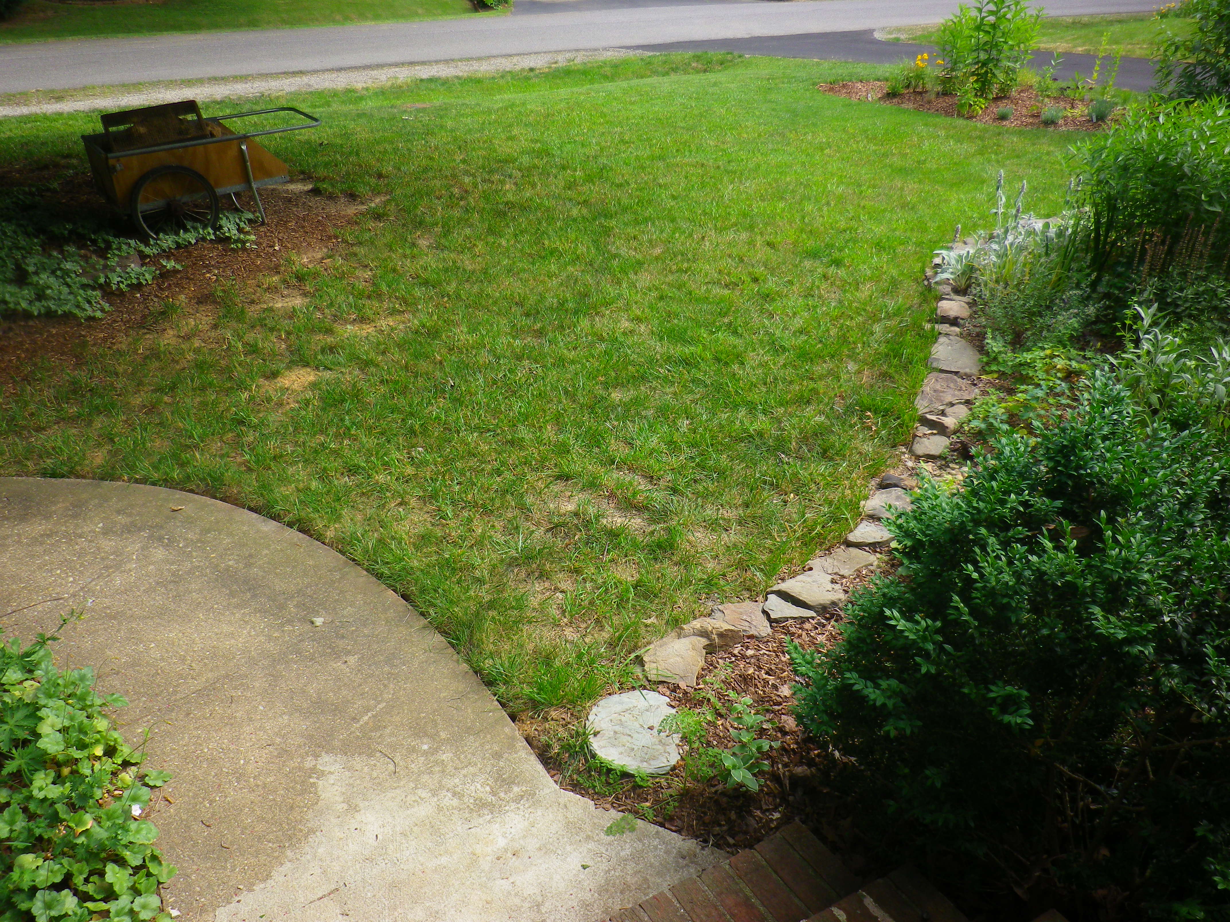 And the grading that prompted this whole thing looks very nice. The sewer people had uprooted the yews that grew against this wall, and I didn’t replant them. The rhododendron that I planted last year up and expired, though I have high hopes that a new one will have a better chance to staying alive.