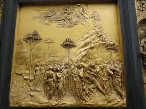 The doors were usually thronged with tourists, but we did get close up one evening. Here is Moses receiving the tablets, with angels rejoicing. This is from the door by Pisano.