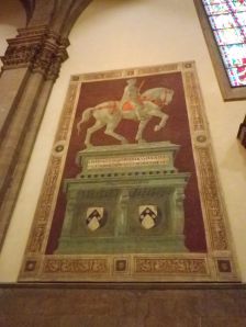 The Duomo is oddly bare inside because most of its most precious possessions have been moved to the Duomo Museum (q.v.). I was delighted to find that bandit Sir John Hawkwood, aka Giovanni Acuto (since Italians have no H, W or K in their language), just as Frances Saunders had promised, displayed on one wall just as if he had not changed sides dozens of times and been responsible for lots of Italian deaths during his career as a mercenary.