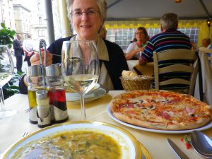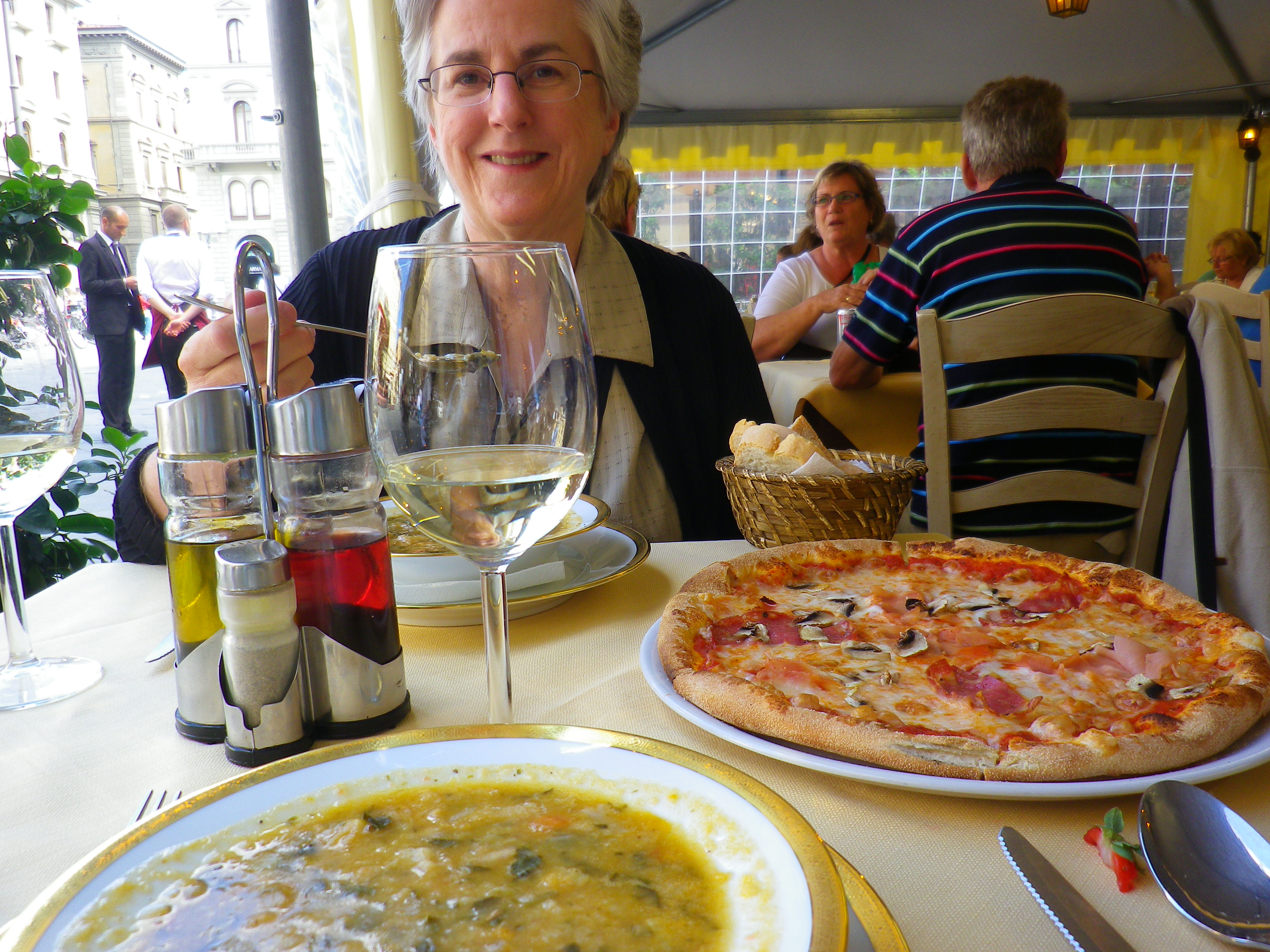 Time for a rest! We headed to the Piazza della Repubblica, where we sat down at one of the touristy restaurants right on the piazza. The waiter was charming, looking out for his “two ladies.” Corny, but who cares. We had ribolitta (bread soup) and a glass of wine and shared a pizza with funghi and prosciutto. Yum.