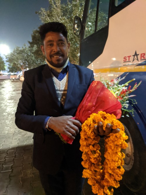 We left Delhi and our guide about mid-afternoon and headed for Agra in a little bus with seats for fifteen, so we each had room to spread out our marigold necklaces, bouquets of flowers, and personal needs (water bottles which are passed out by the guides throughout our trip, purse, phone, guidebooks, snacks, etc.). It was a long, long drive to Agra through very flat country but worth it in the end. We had a delicious late dinner (not my usual style but I survived!).