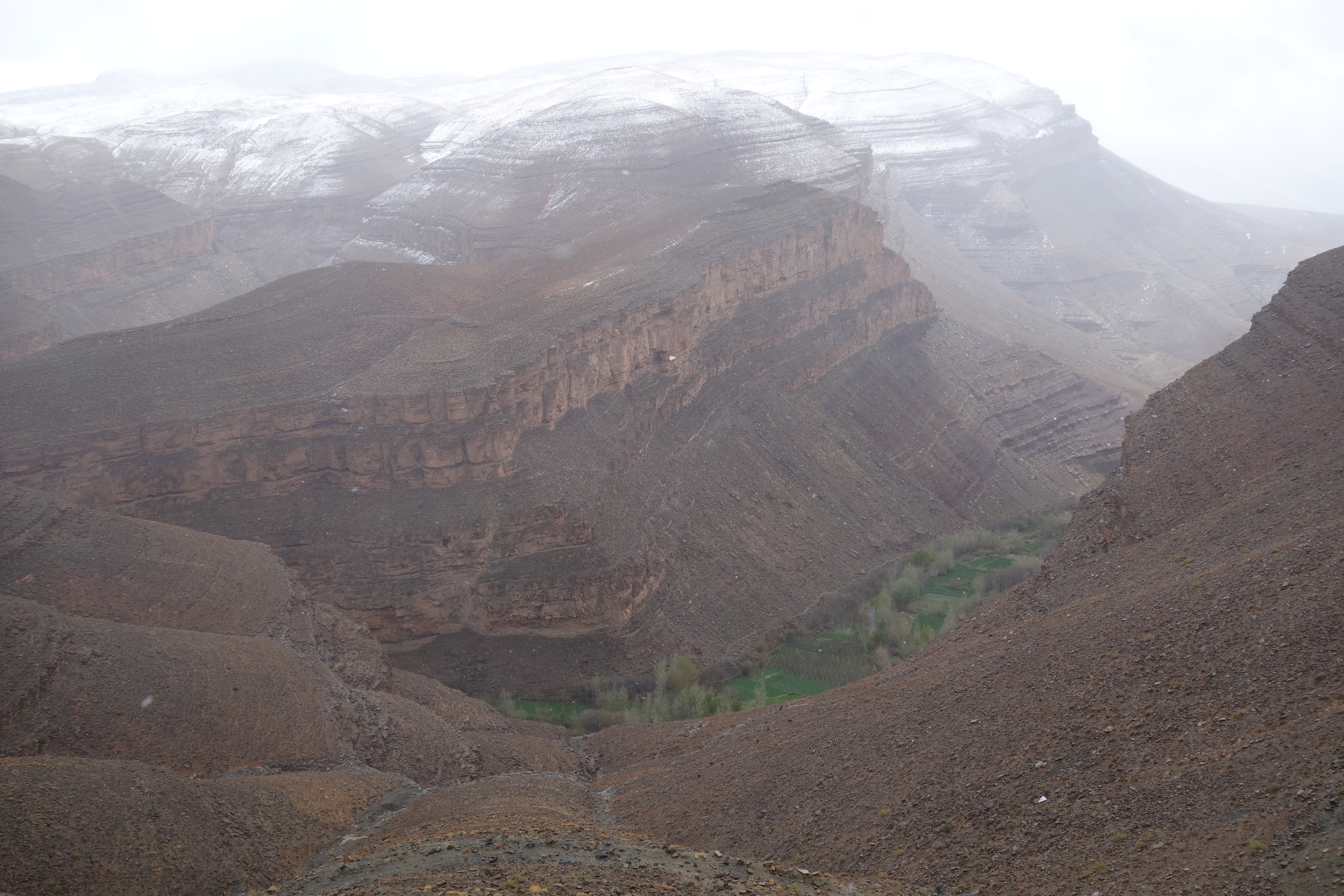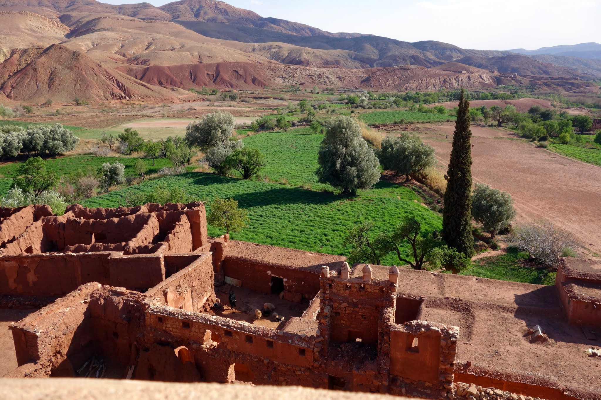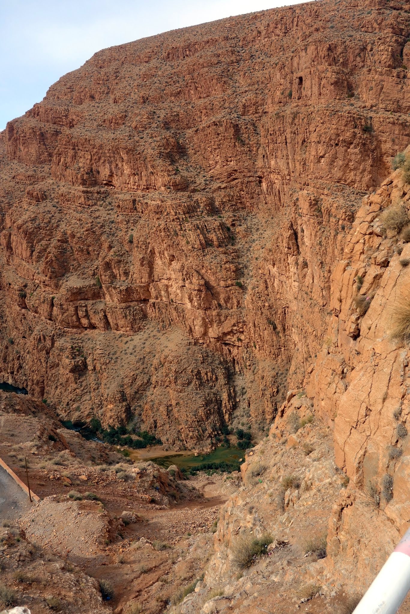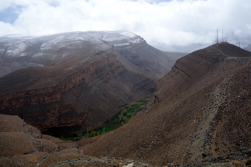 And then we continued to go up. We were in the High Atlas mountains now. Down below are the gardens growing on the lush valley floor,