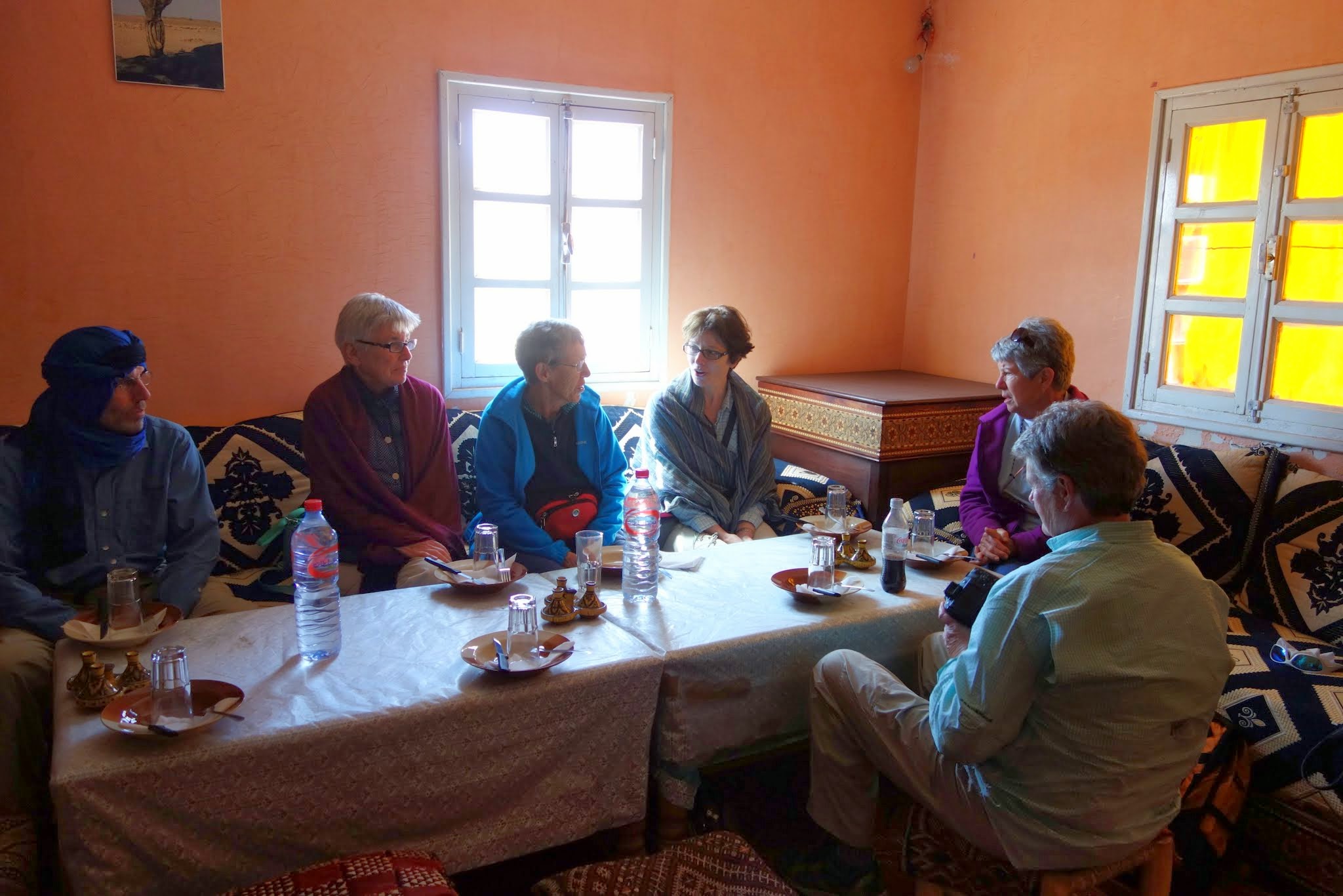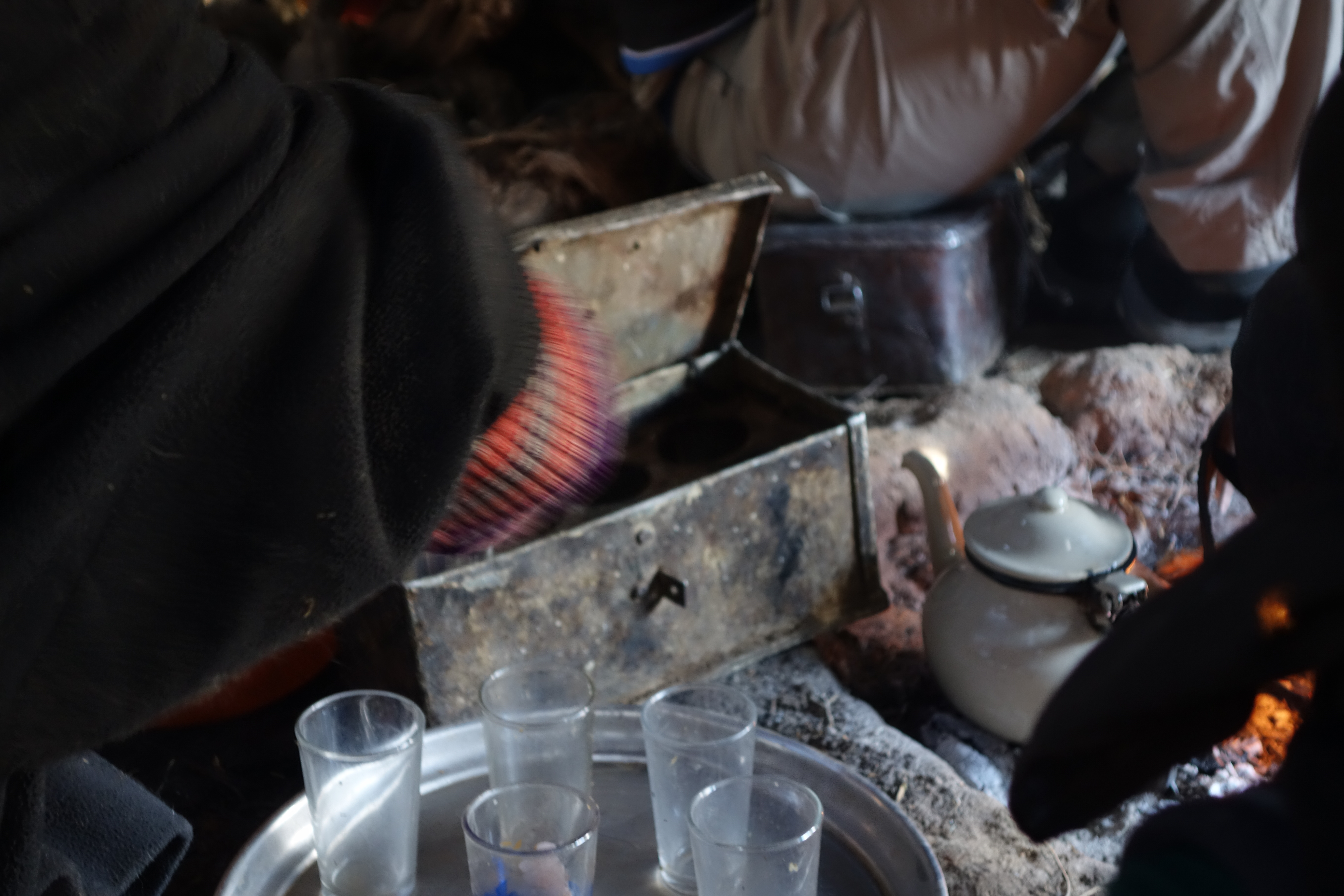 We had brought them a box of tea and two cones of sugar. She poured the tea into the teapot and hammered off a piece of sugar as well (mint tea is traditionally served sweet, like iced tea in the South). Then she poured the boiling water into the pot, poured it into glasses and handed around the tray.