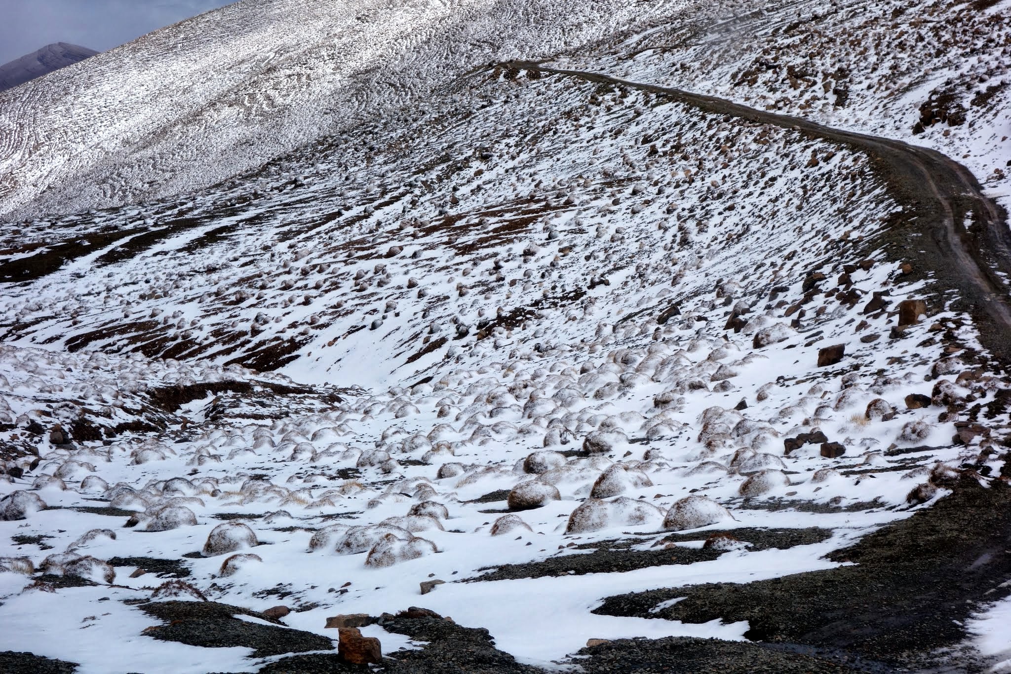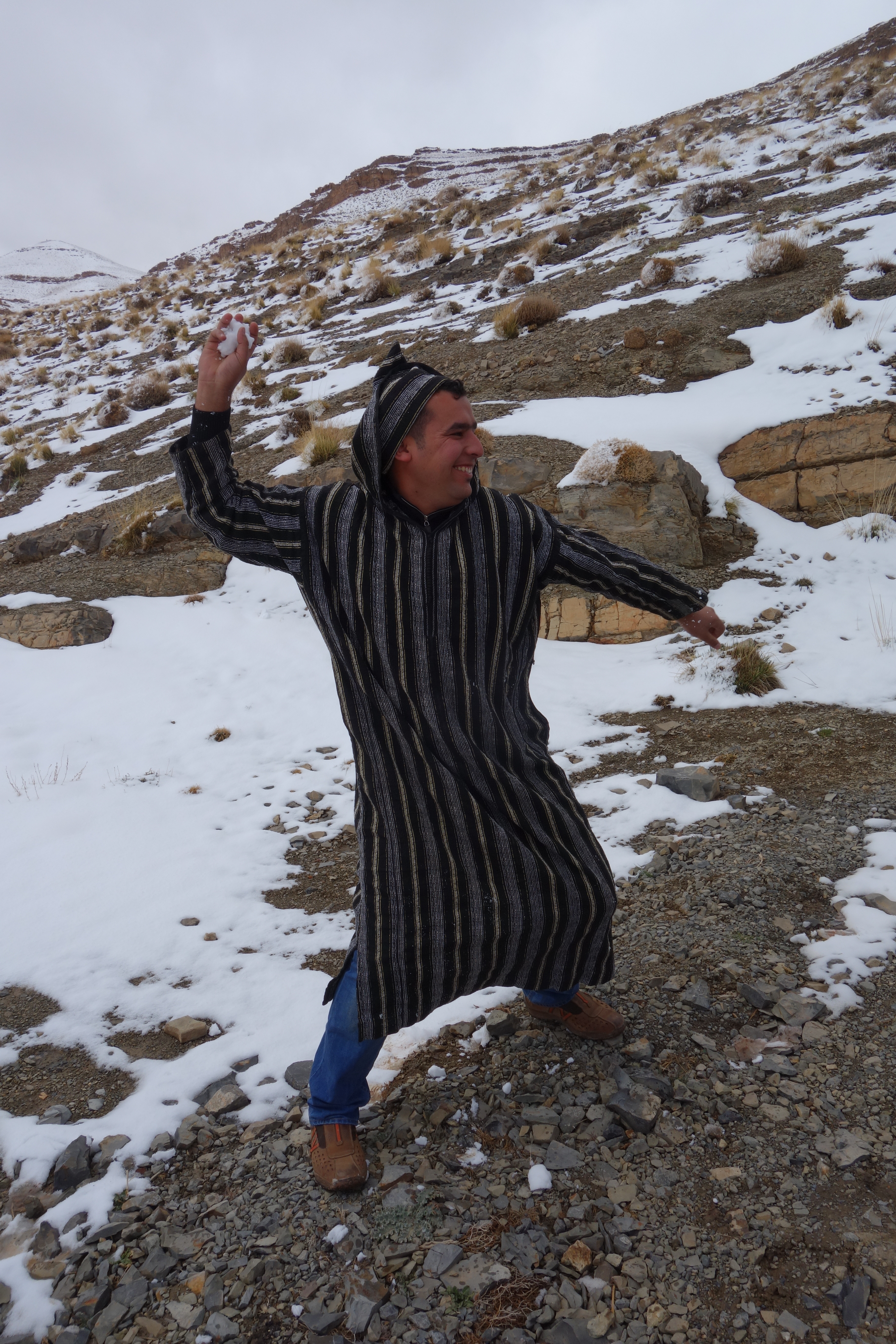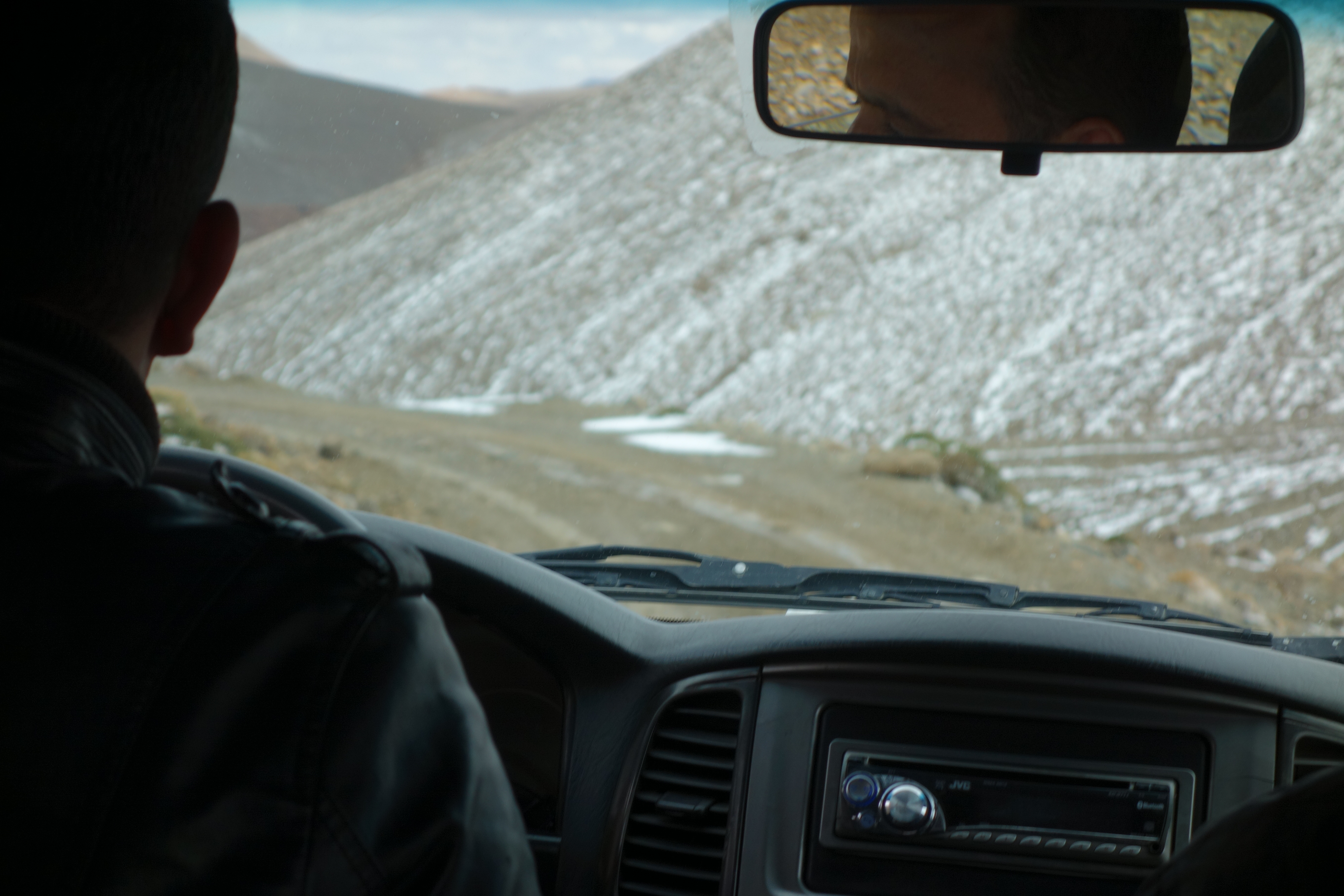 The road went on and on. Rocky hills and snow-covered mountains loomed up over and over again. We saw an occasional bird, too far off to identify, a lone man riding a donkey, another man standing next to a tent in the distance, and once a group of goats and donkeys. We stopped partway up to take photos, and of course the men had to throw a few snowballs.