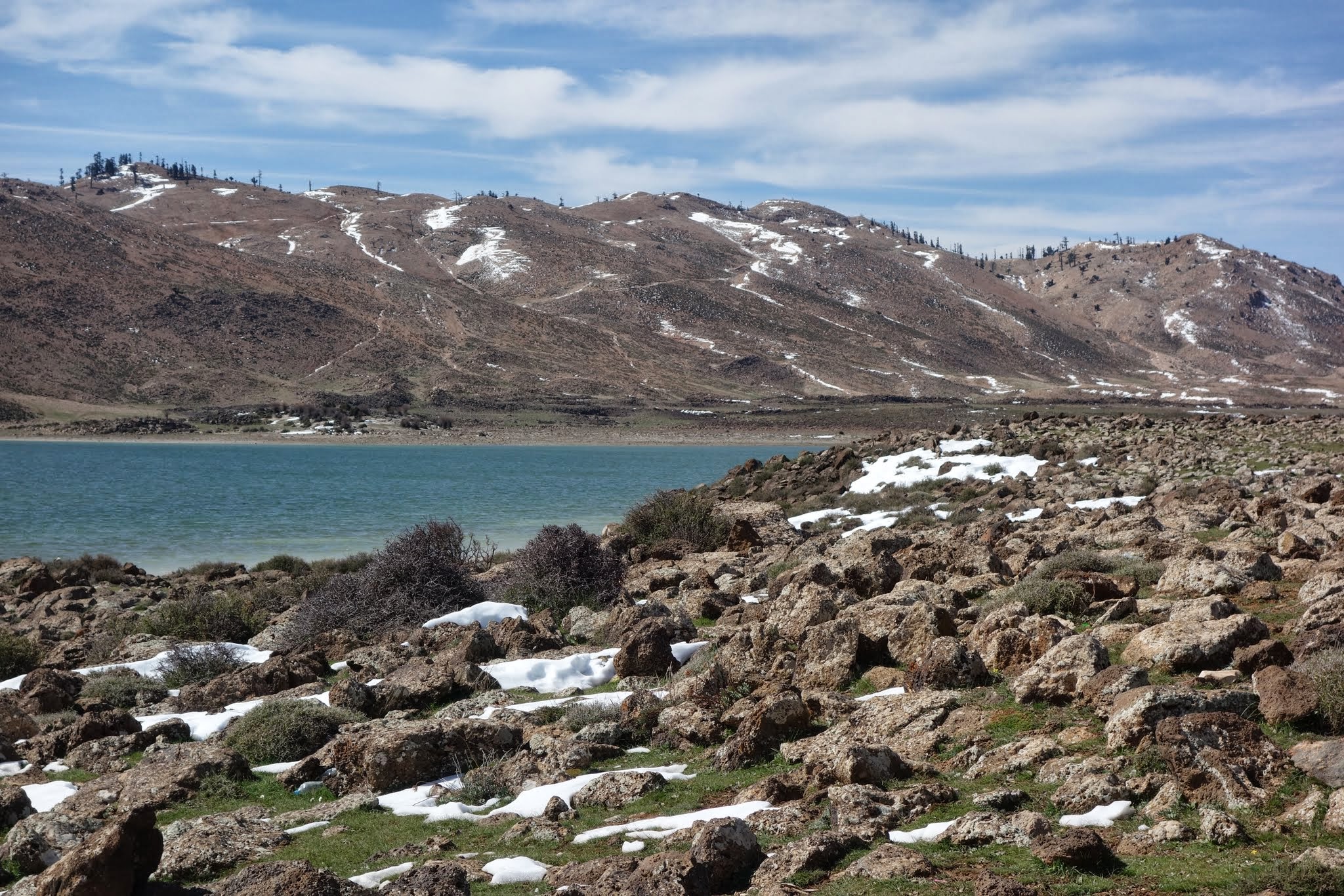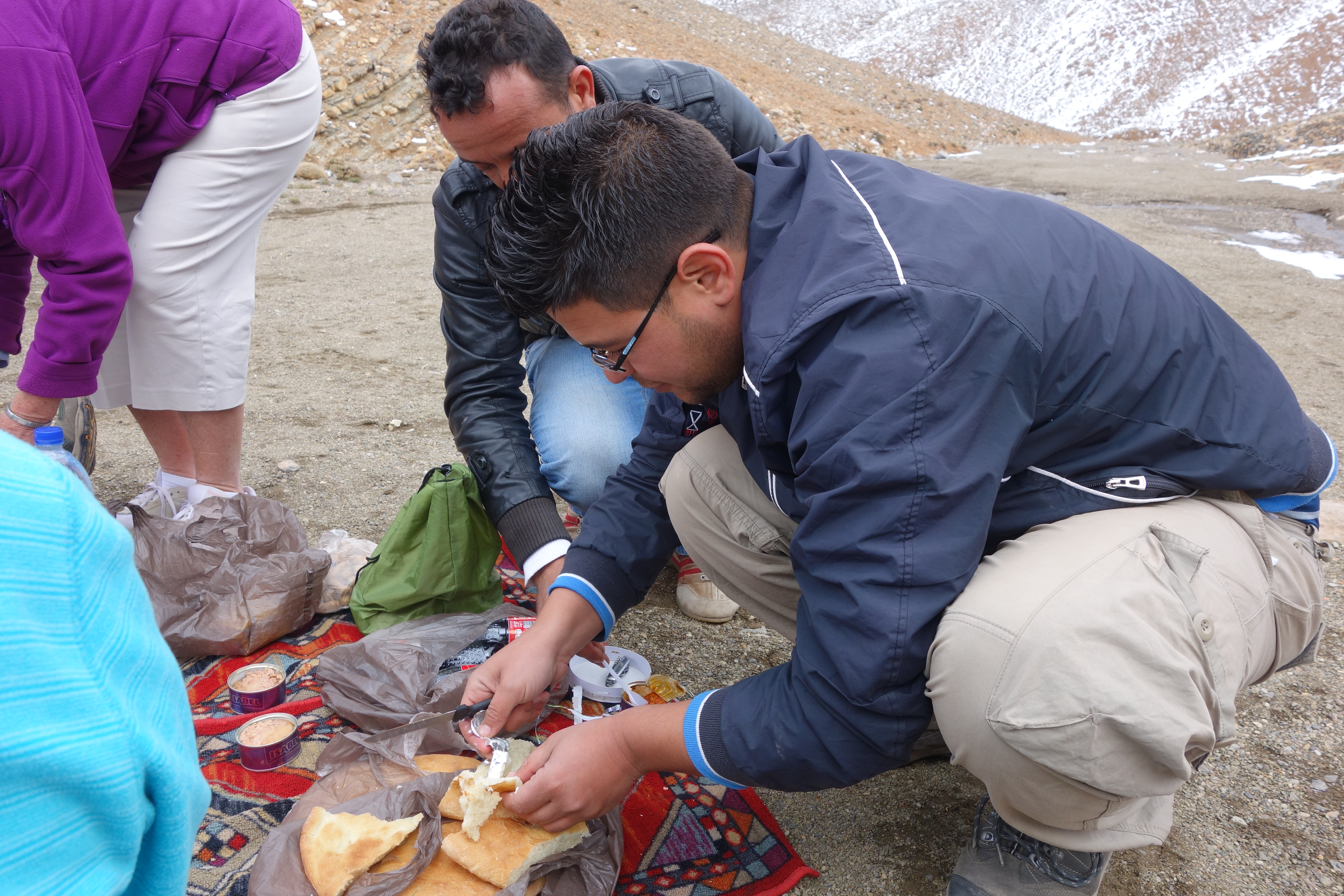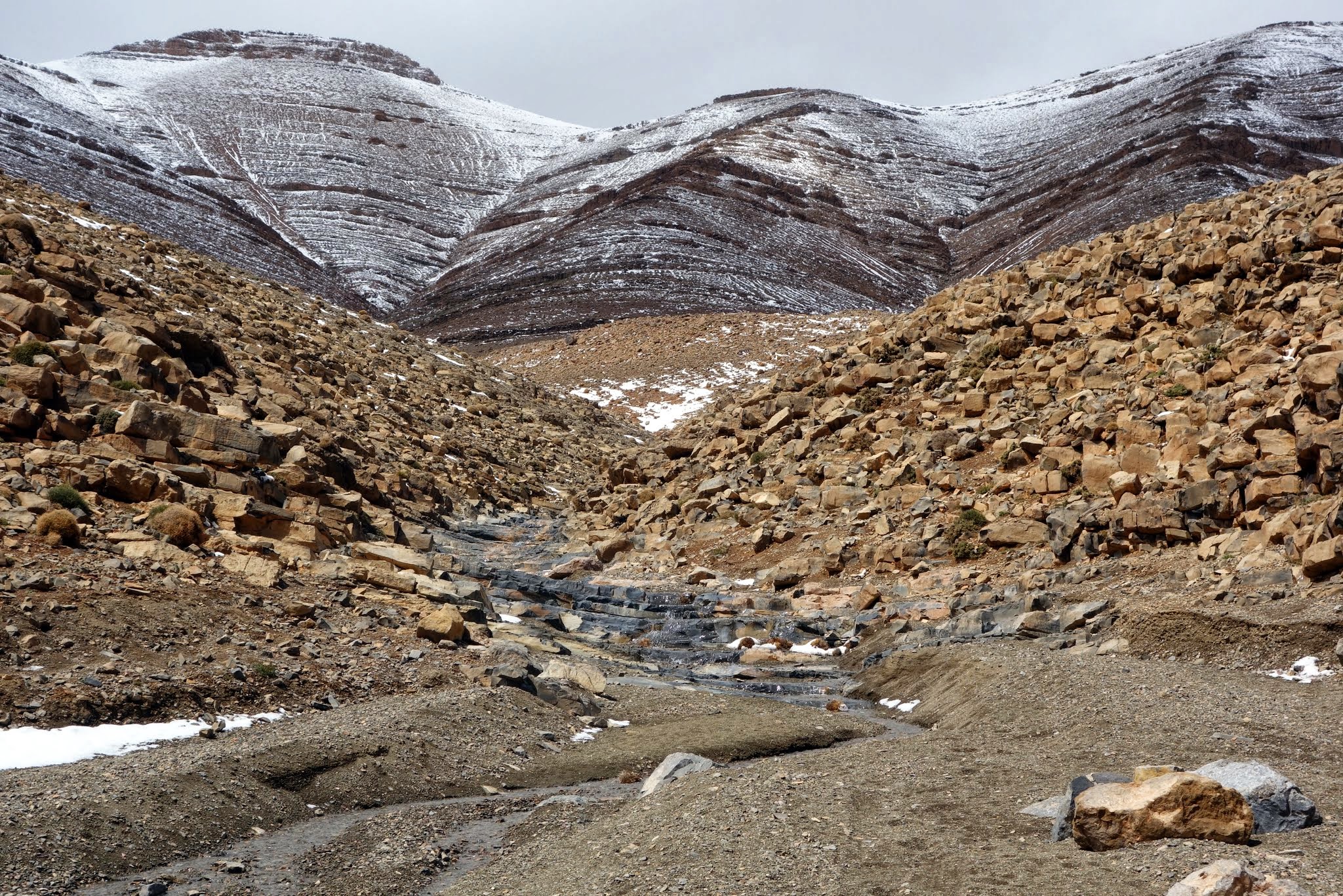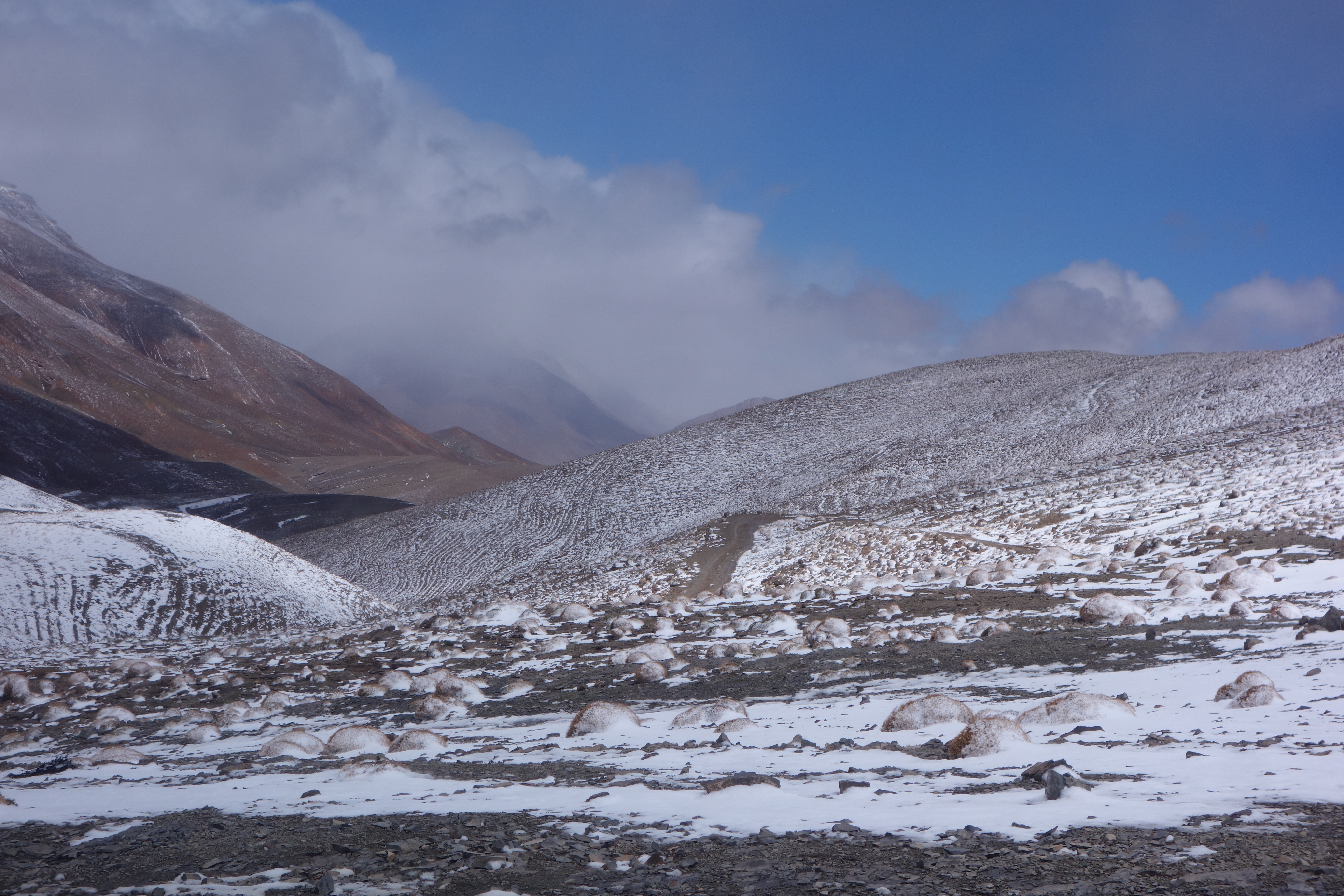 The road went on and on. Rocky hills and snow-covered mountains loomed up over and over again. We saw an occasional bird, too far off to identify, a lone man riding a donkey, another man standing next to a tent in the distance, and once a group of goats and donkeys. We stopped partway up to take photos, and of course the men had to throw a few snowballs.