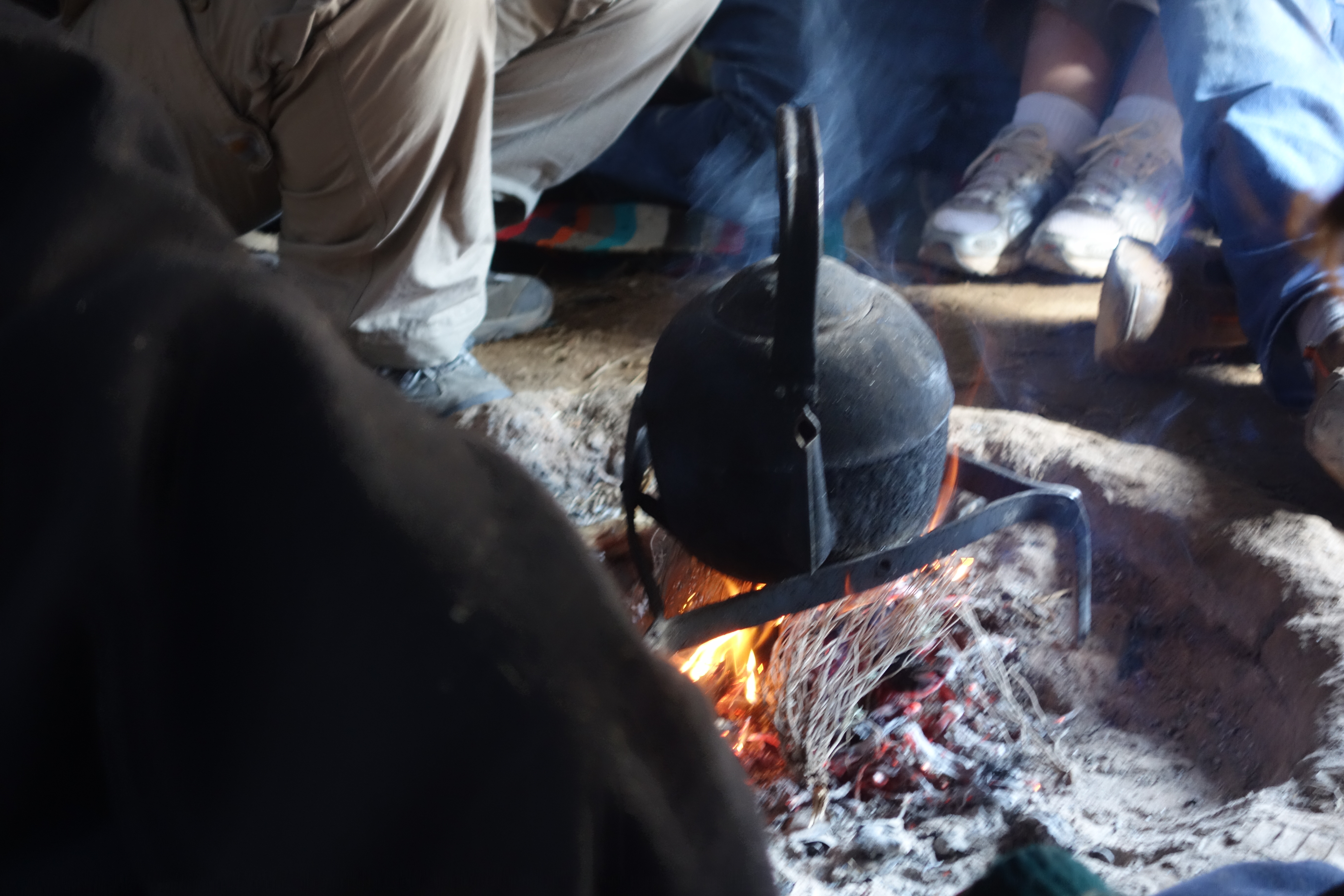 At last we arrived at our destination, marked by the children rushing up to the cars in great excitement. Across a rocky track to the tent, edged in stones, covered in a fabric woven from goats’ and sheep’s wool, with a fire burning in the center. The smoke permeated everything with a delicious aroma.