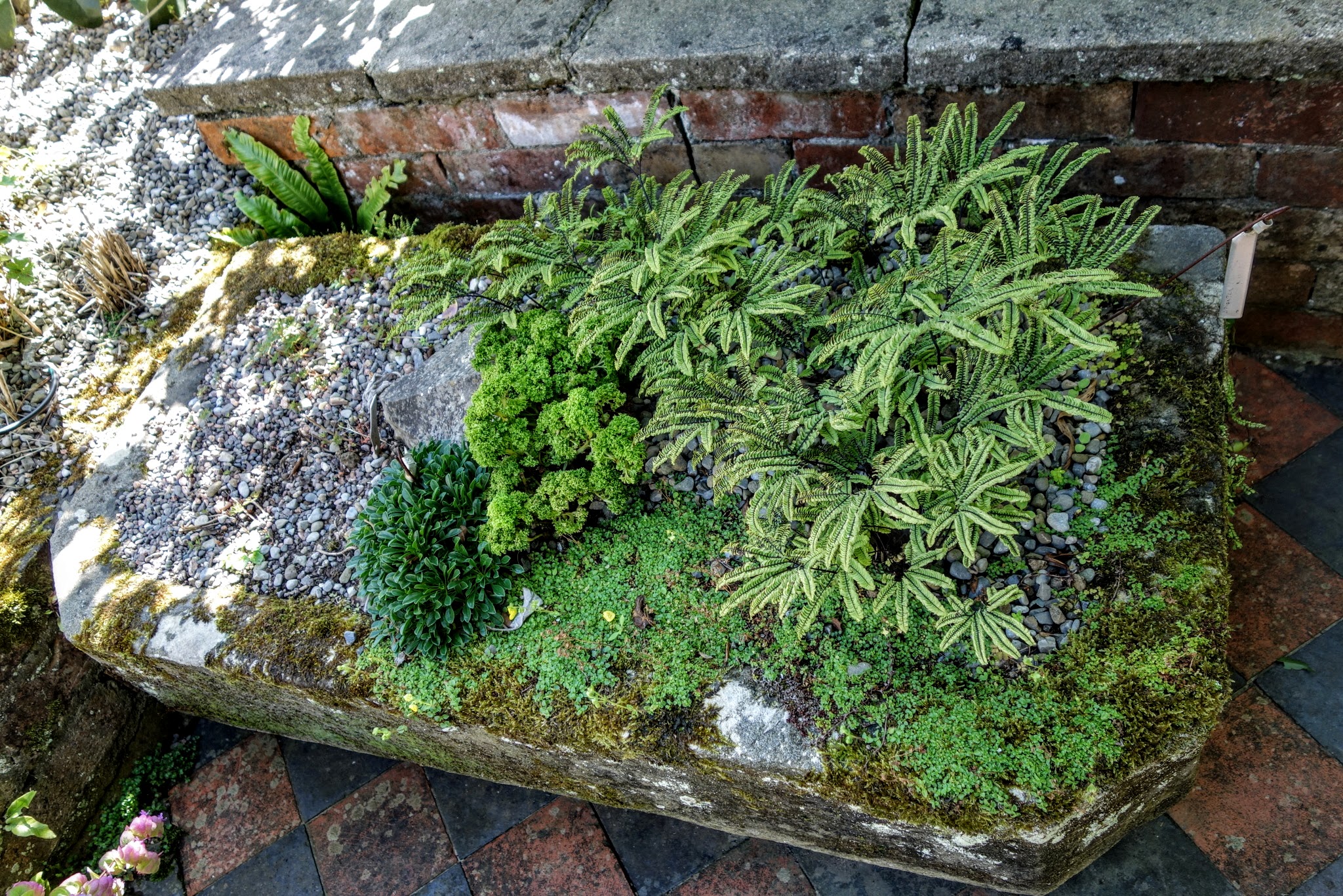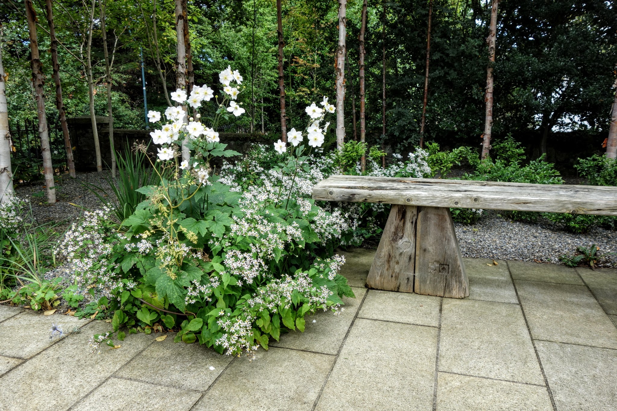 Elegant Japanese anemones, dittoBox bushes shaped to echo a nearby potDelicate maidenhair fern in a concrete trough