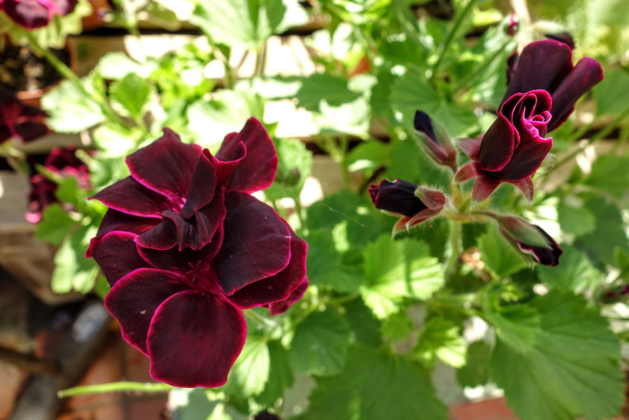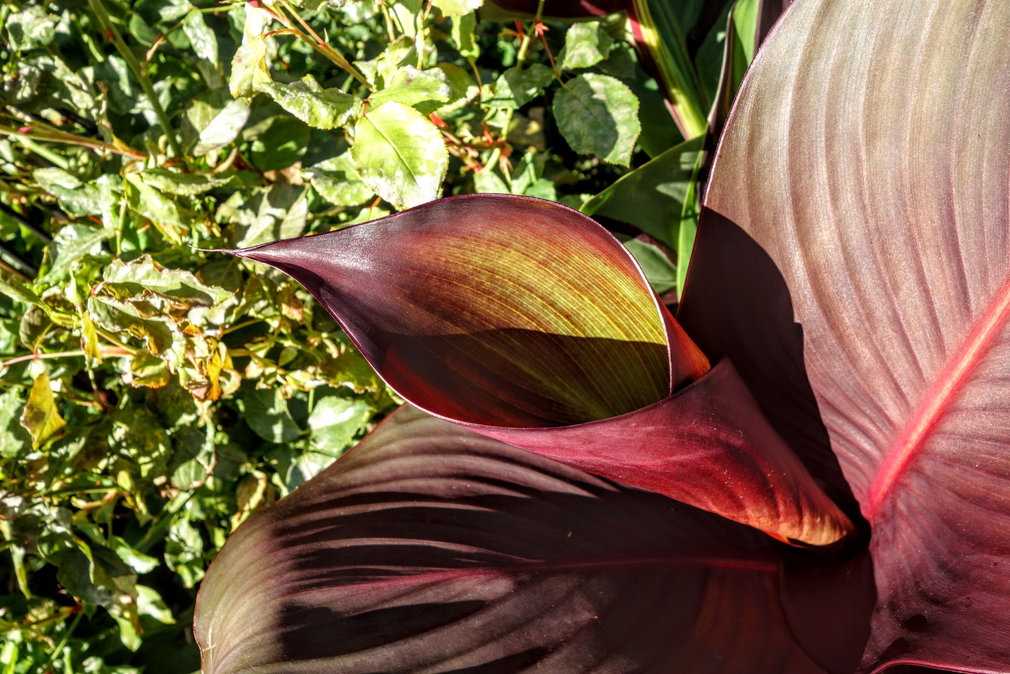 Here are some red things. I know the dark leaf is a canna, but I’m not sure about the pinky red flowers in the pot.