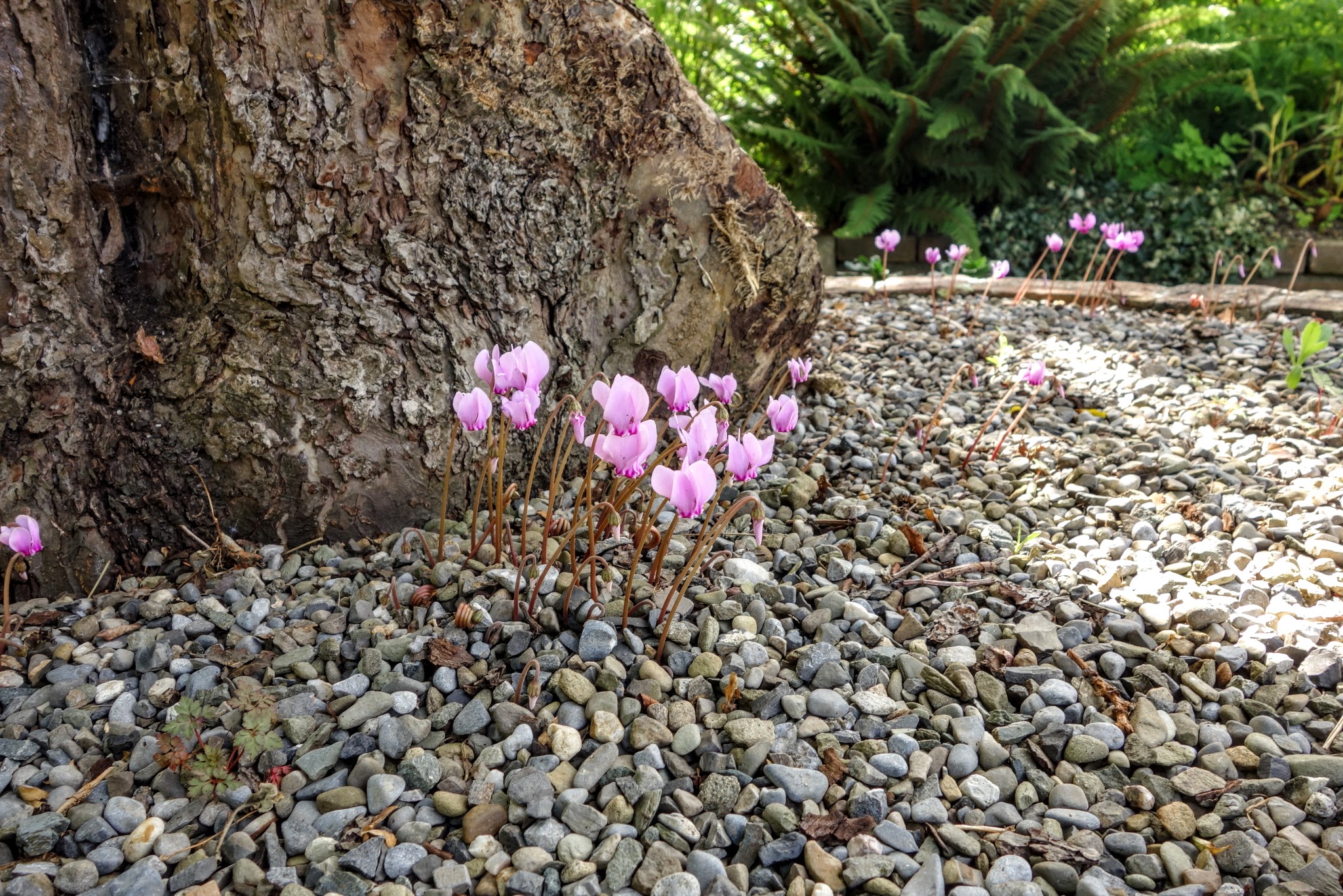 Garden by the driveway on the way outsnails’ trailsAutumn cyclamen growing in pebbles