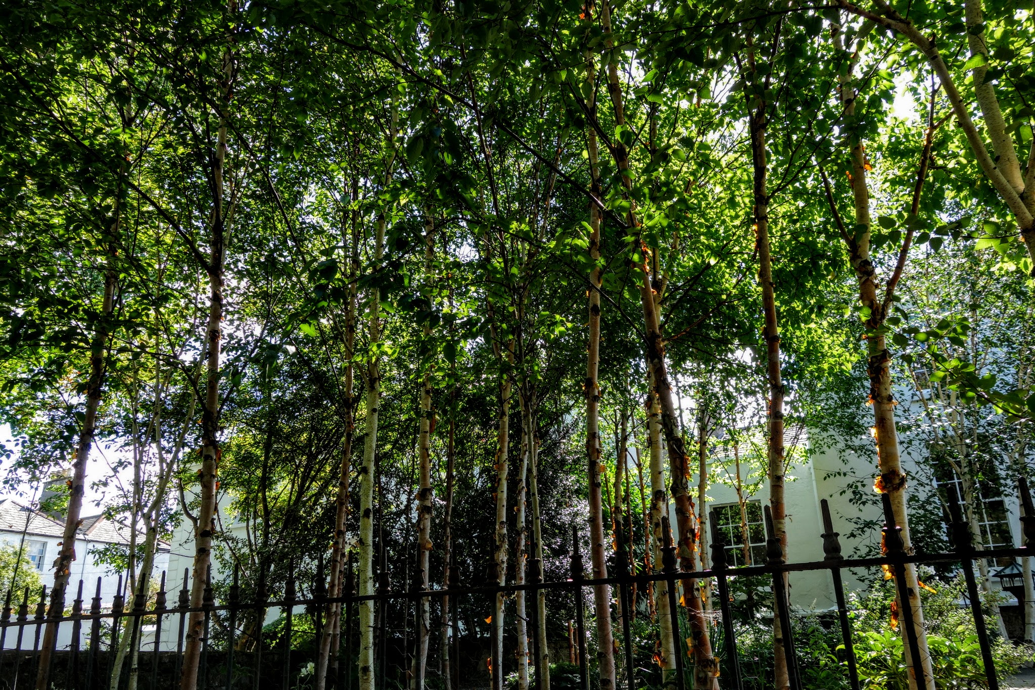 I plant woodland aster under the maple tree in front because they can take the dry shade that is a constant challenge in this garden. Helen, on the other hand, pairs them with white Japanese anemones. Now, I have tried anemones three times and they never come back, but maybe this time will be the charm. Her asters are a bit more floriferous than mine, but then I guess I could actually water them occasionally and see if that makes a difference. This is in the front garden, which she has made into a birch grove and a very quiet, serene place. Here it is from the street.