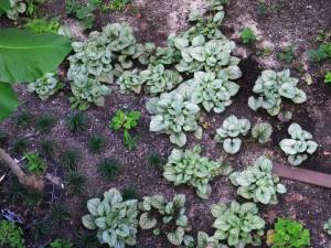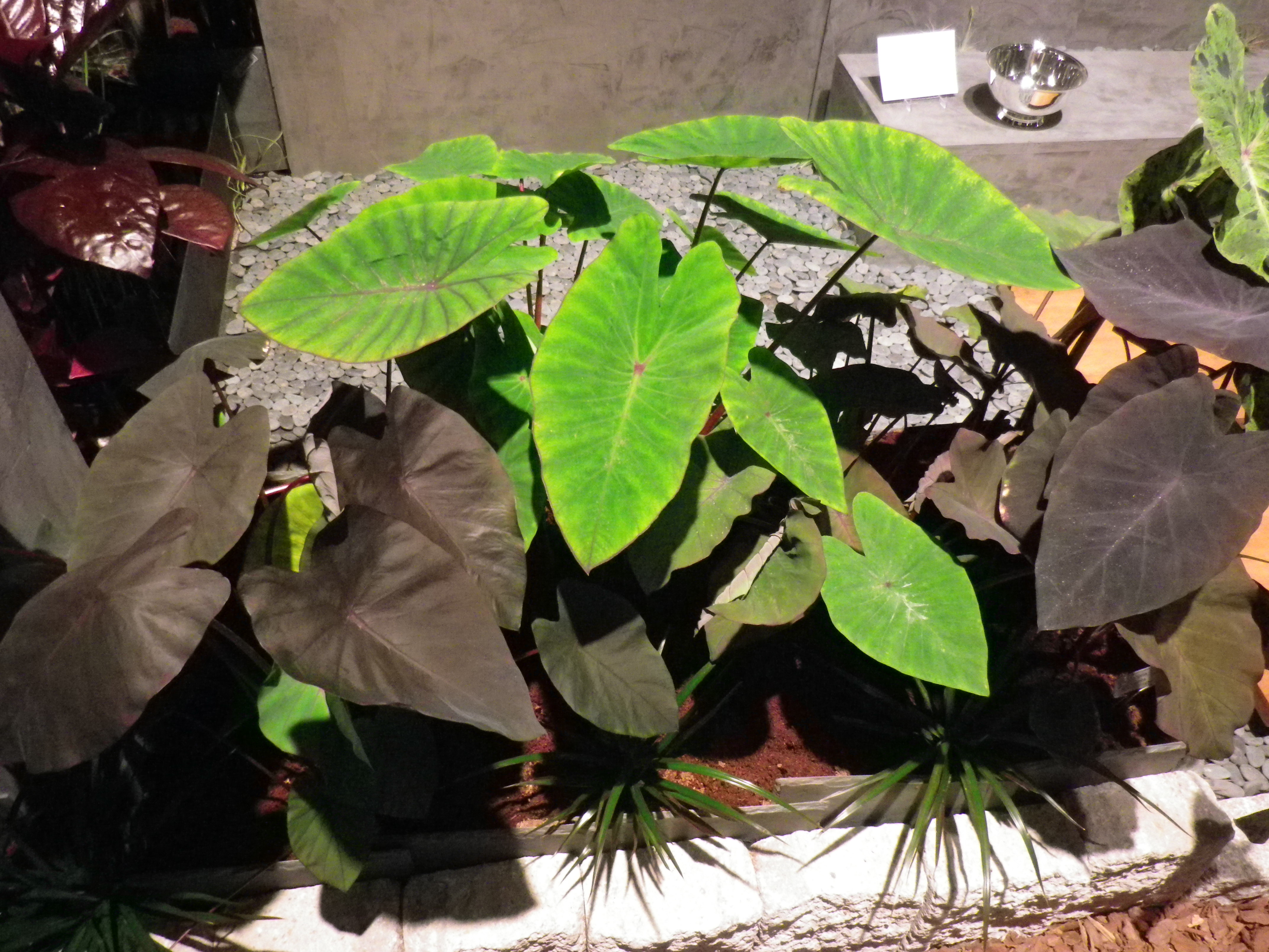 Once you’re over the dazzling colors of the tropicals, you start to notice the beautiful array of leaf colors and textures. Here is a simple but effective display of colocasias.