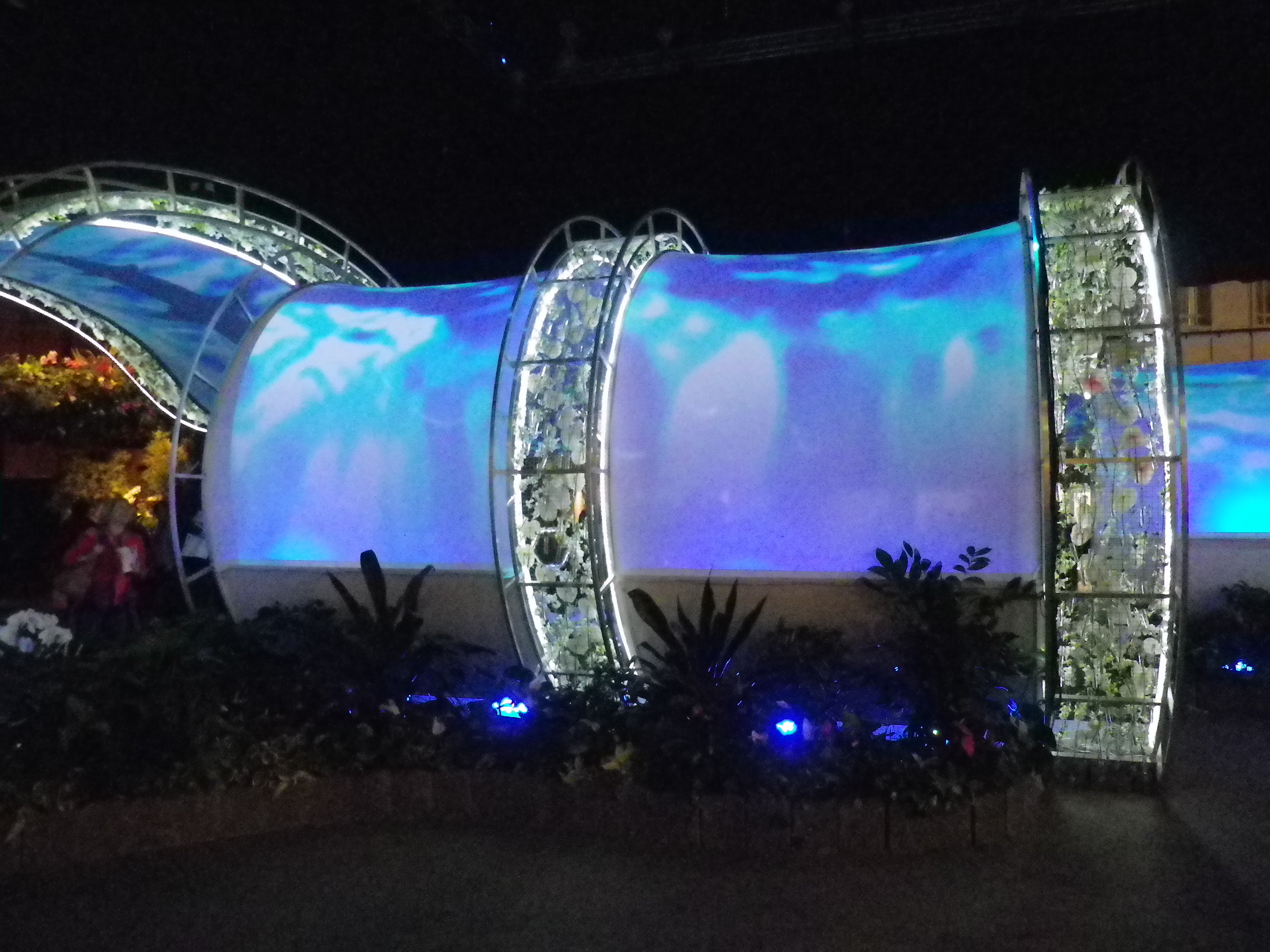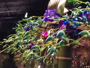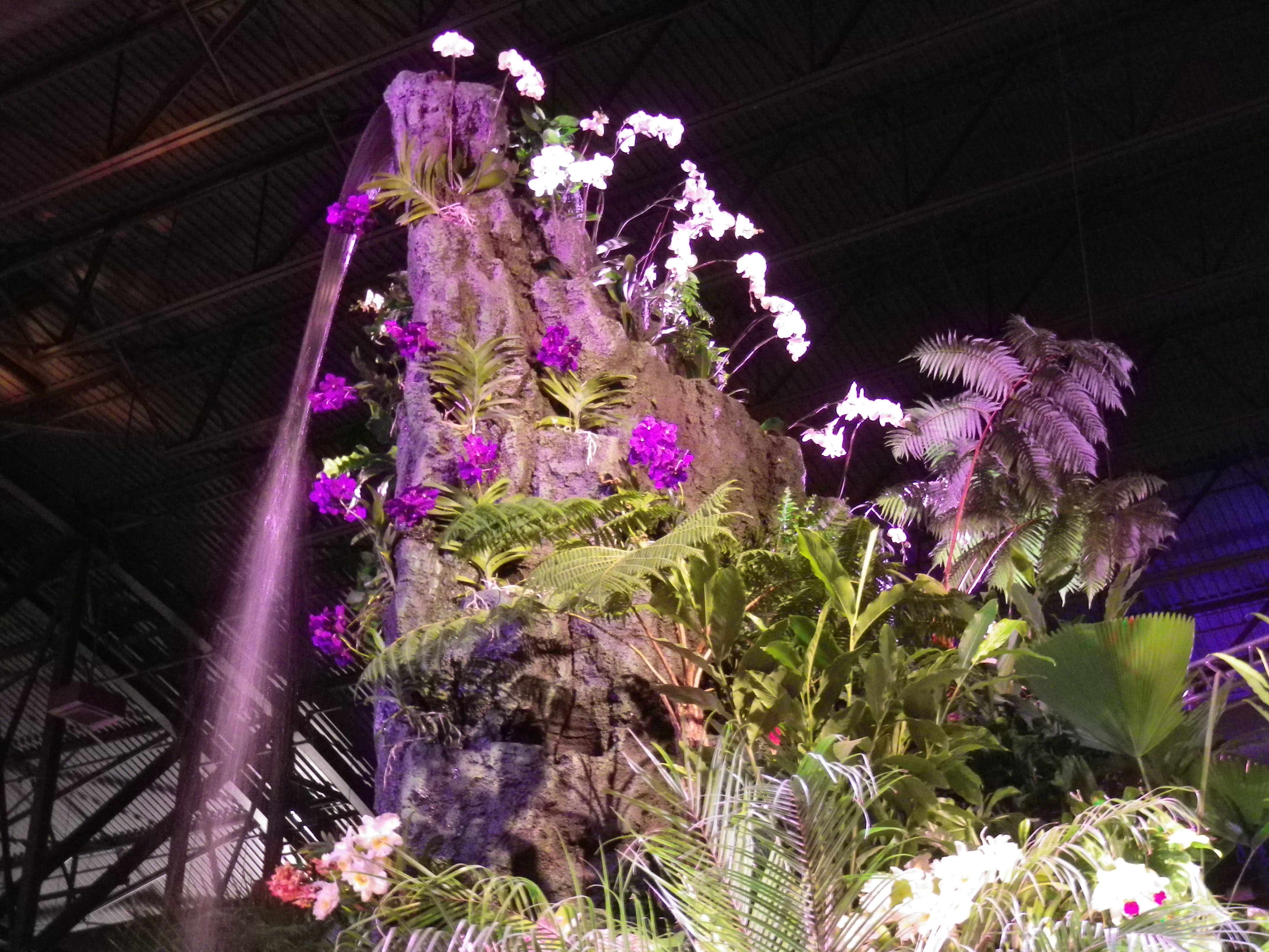 Next up is a thirty-foot high waterfall ringed with tropicals, mostly orchids, and illuminated with lights in every vivid tropical color you can imagine.