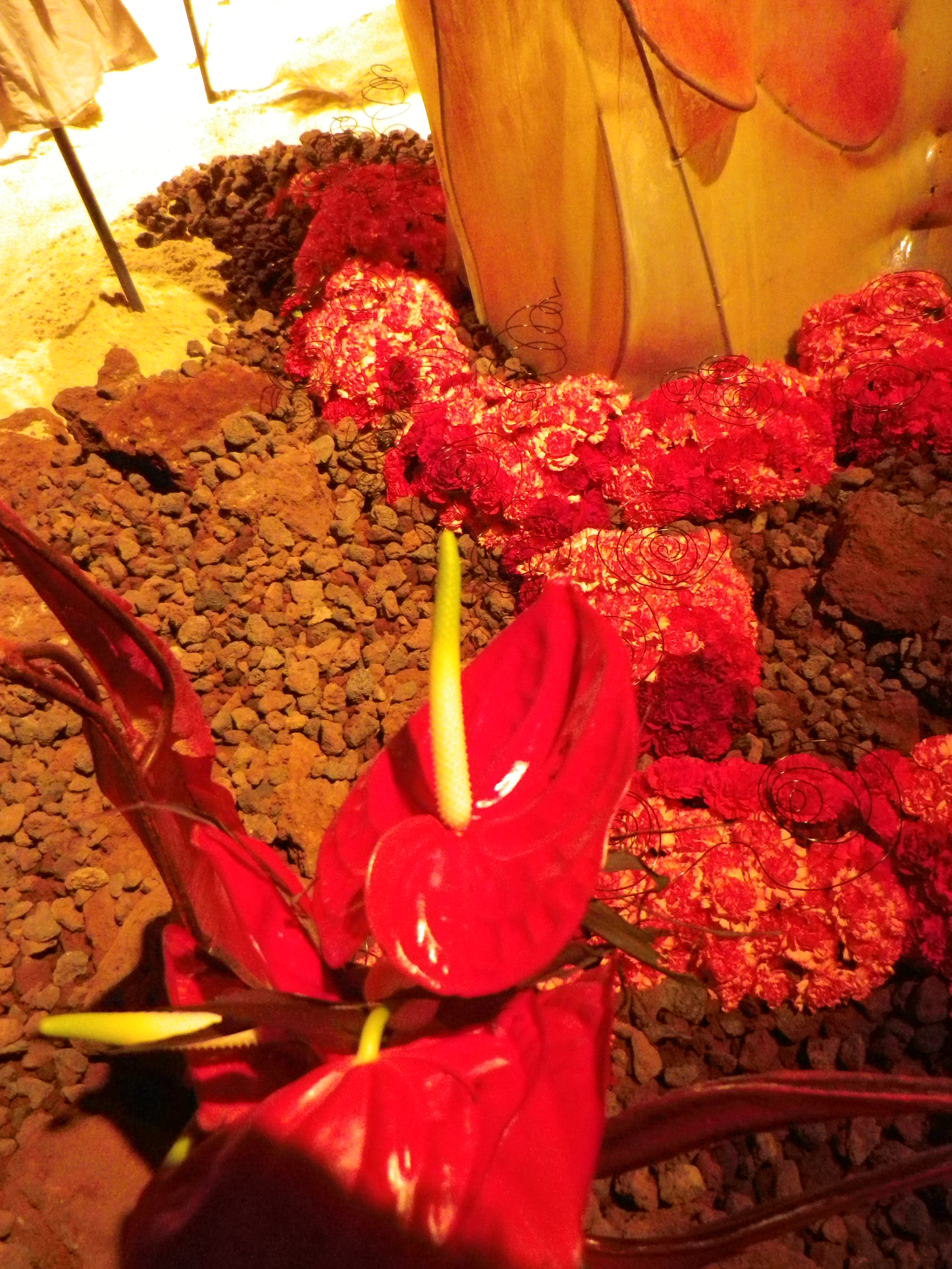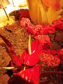 Anthuriums were everywhere. Mom and I always agreed that they weren’t quite nice, not to say icky, but when you see them used right they can actually be attractive. Or, at least, interesting. I’m still not convinced. The greenish ones are less intrusive than the more common red ones.