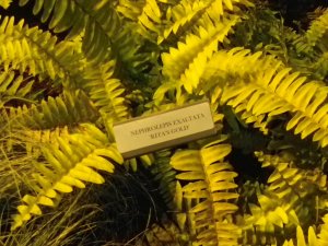 Nephrolepsis Exaltata ‘Rita’s Gold’ looks like a golden fern and turns out to be the plain old Boston fern, only gold.