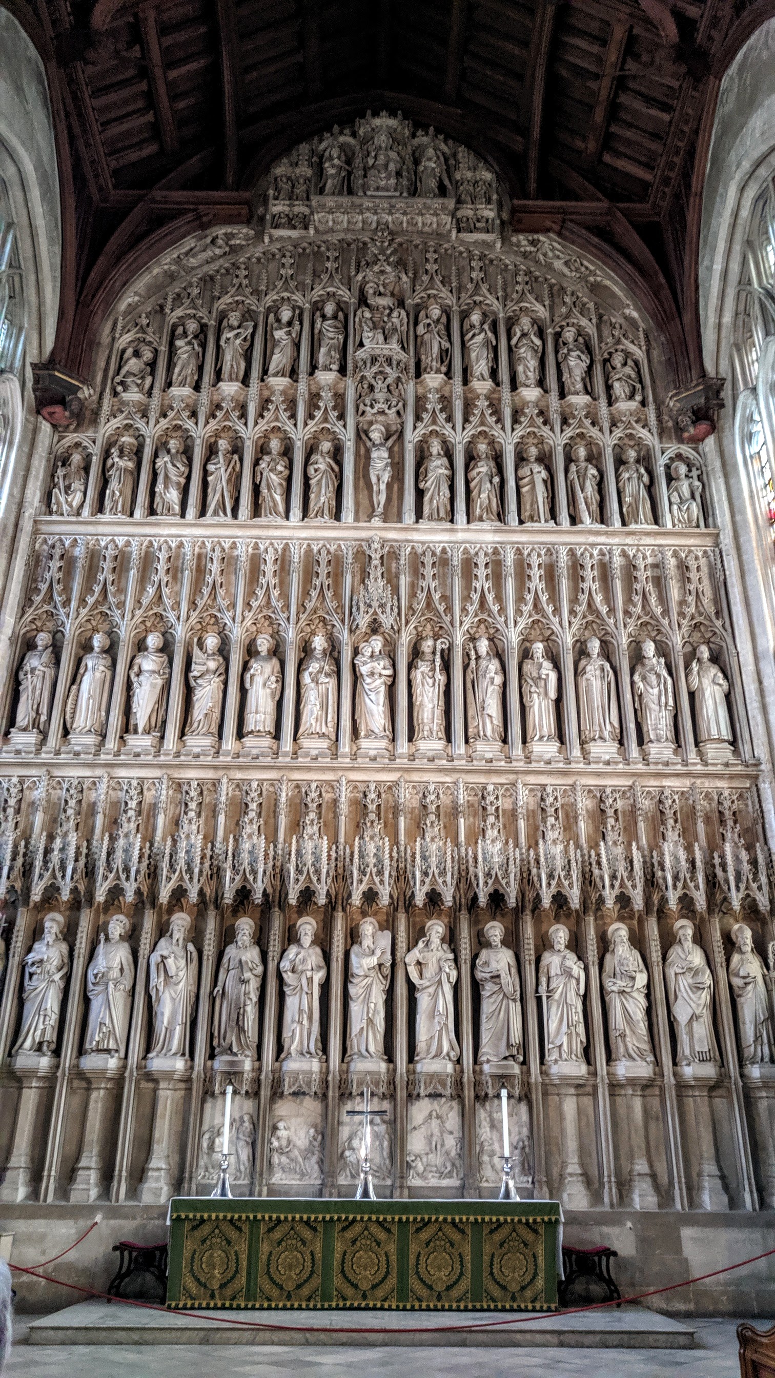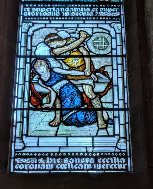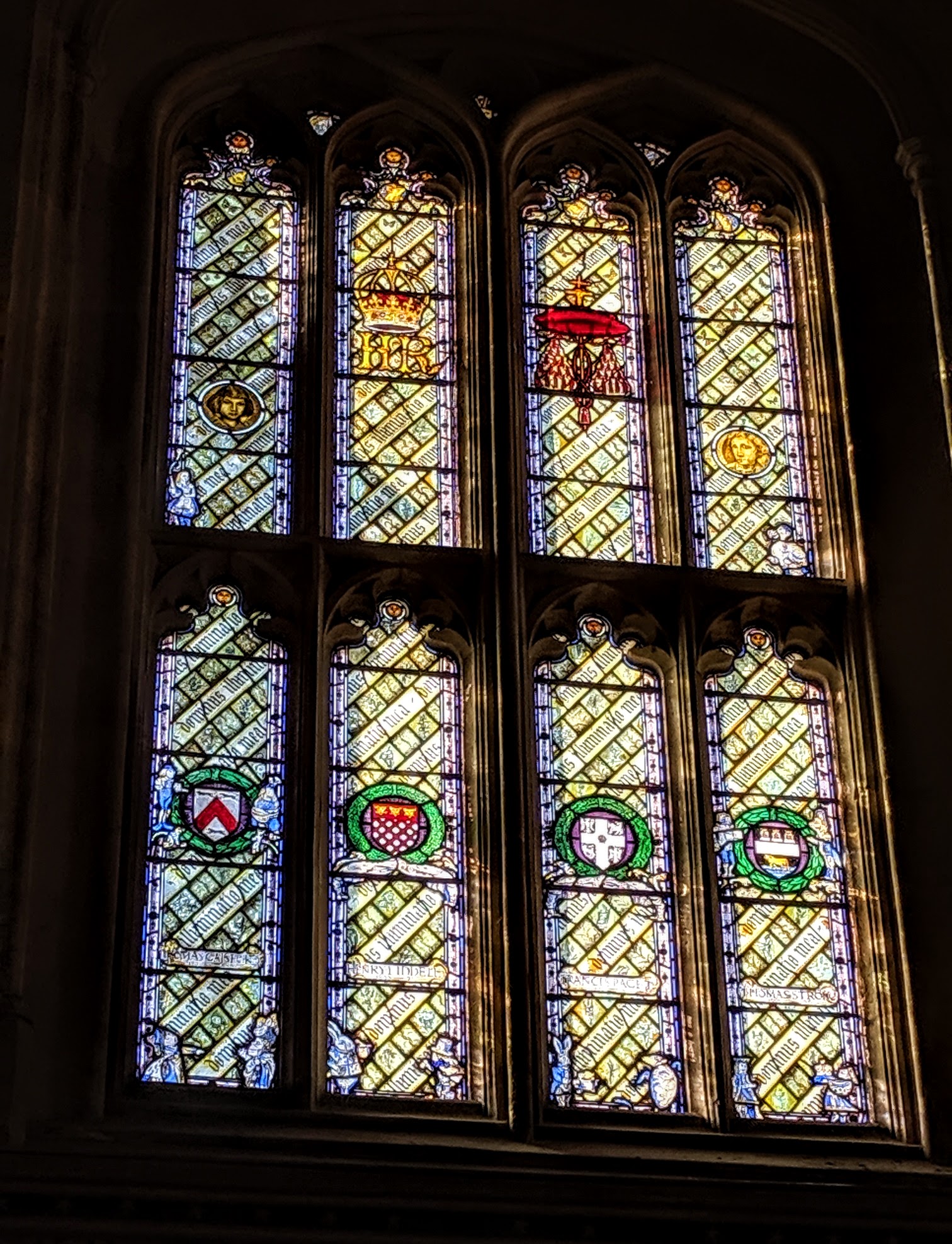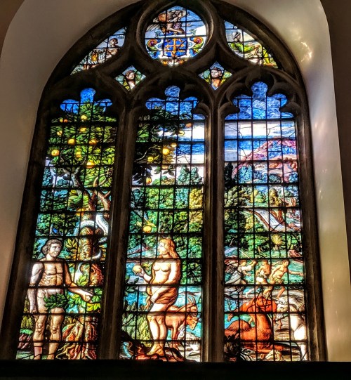 I had read Jane Brocket’s How to Look at Stained Glass before our trip and made notes on places she mentions, this being one. The 17th century windows include a very fleshy Adam and Eve,