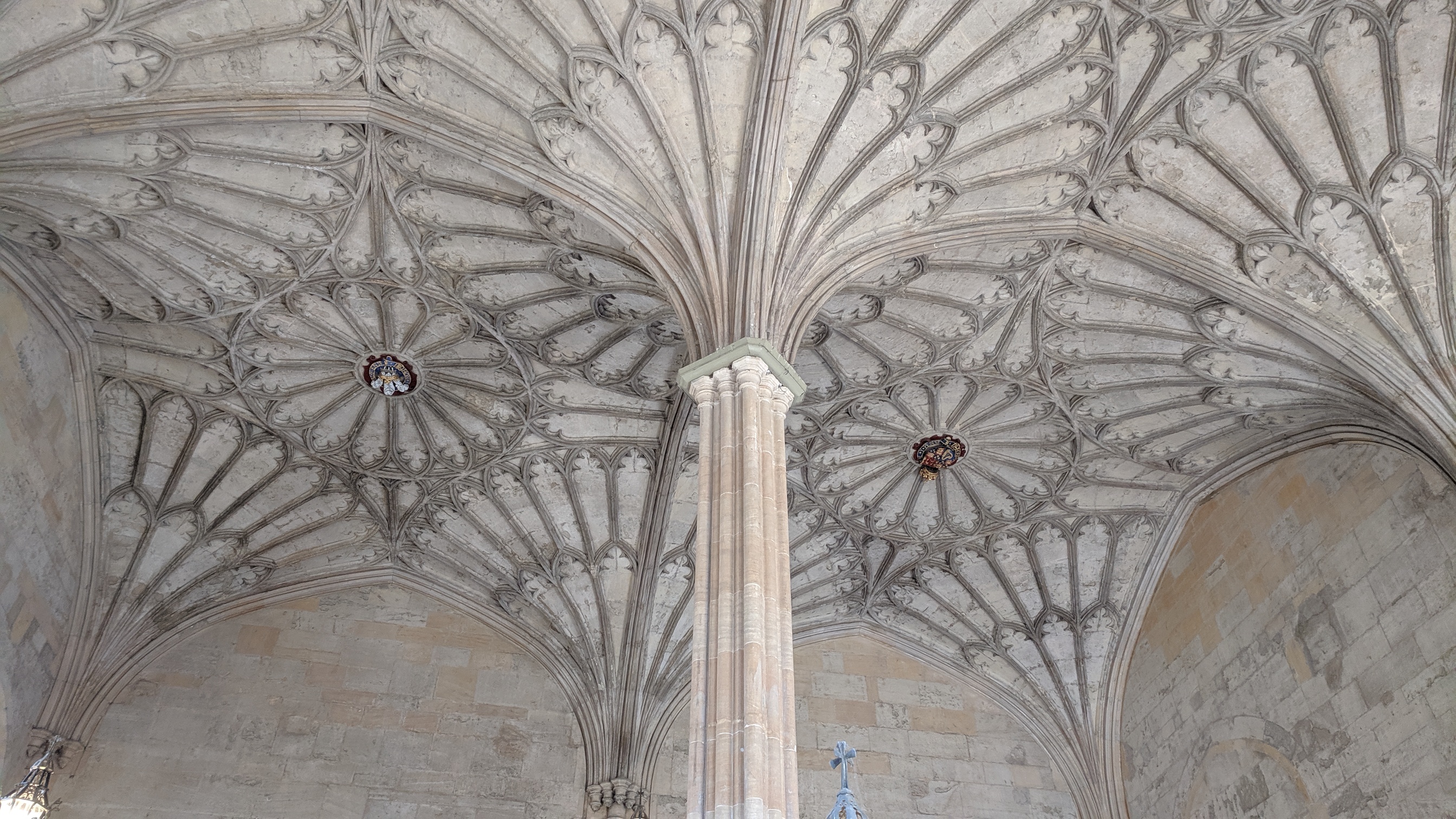 No flames allowed and no electric light or heat till the 21st century, so hours were limited. Until a few years ago, scholars placed their book requests through a pneumatic tube system, which meant you waited about three hours before your books arrived at your desk. The system is online now, so much faster. Shelves and shelves of ancient books, some rows turned spines in because of the way the chains were attached, with one chain still extant to show visitors. And notice the ceiling!