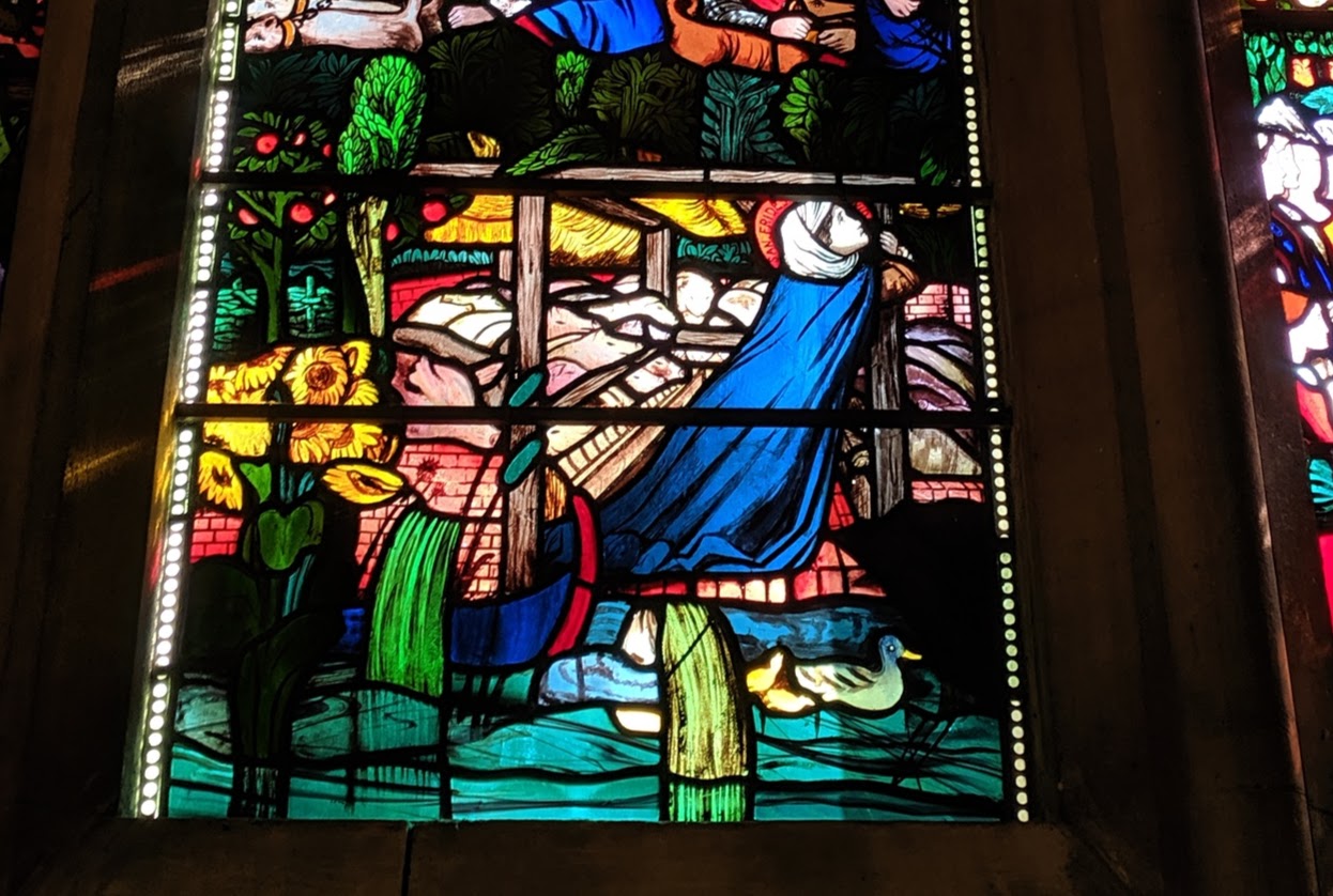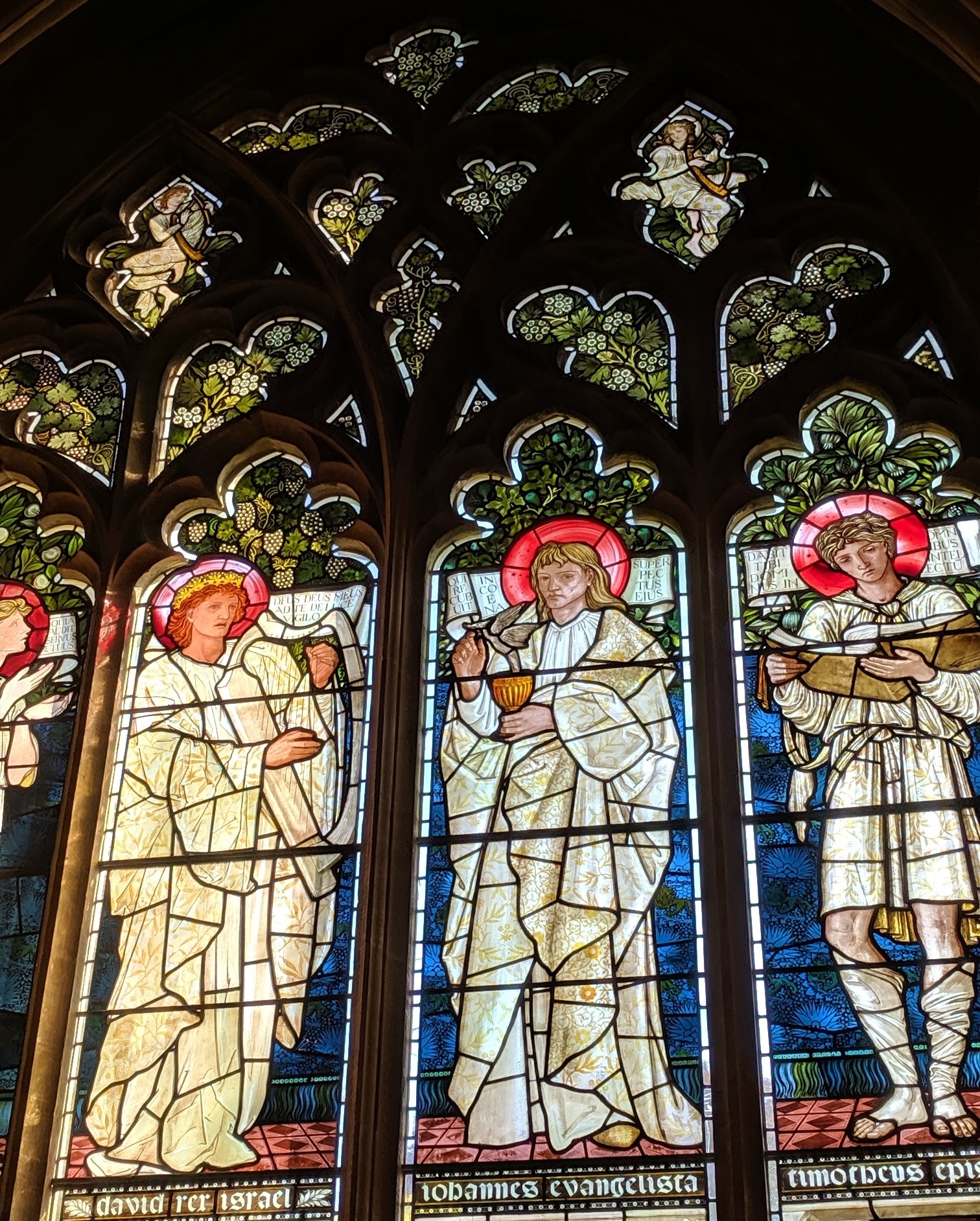 Though I had been here ten years ago, I didn’t remember seeing the cathedral, our next stop. We were on the lookout for Burne-Jones’s windows, which did not disappoint. Here is St. Frideswide, patron saint of Oxford, hiding in the pigsty from the rapacious King Algar,