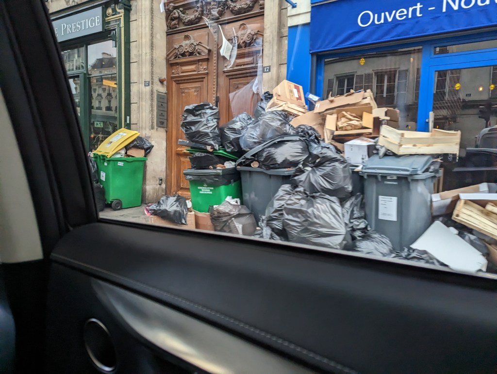 Cedric, our contact, promised that new flooring was to be installed the week after we left, and in the meantime he could offer a rug, which was unlikely to help and in fact never showed up. Alison tread carefully the whole time we were there. And the sight of trash on the streets, seen from the cab, was a glimpse of real life in Paris during a strike, but hardly welcoming.