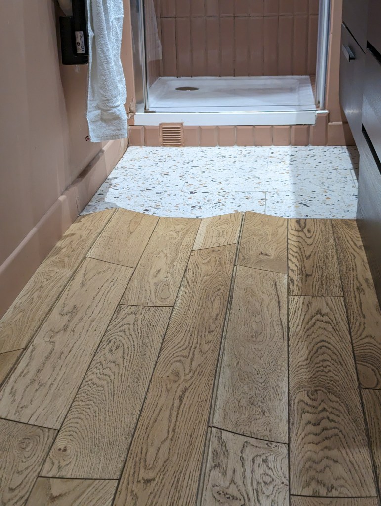 but in real life the space, though roomy, was dark and depressing, especially the bare gray flooring (not the warm color pictured) and weird lighting (mostly overhead). The ensuite bathrooms had only sinks and showers, with the shared toilet in a separate spot, which was inconvenient and would have been clearer to us on a closer reading. But the real problem was that the apartment appeared to be in the middle of a half-finished renovation. The kitchen, toilet and my bathroom had recently been updated. But Alison’s bedroom floor was severely buckled, which is a tripping hazard, at the very least.