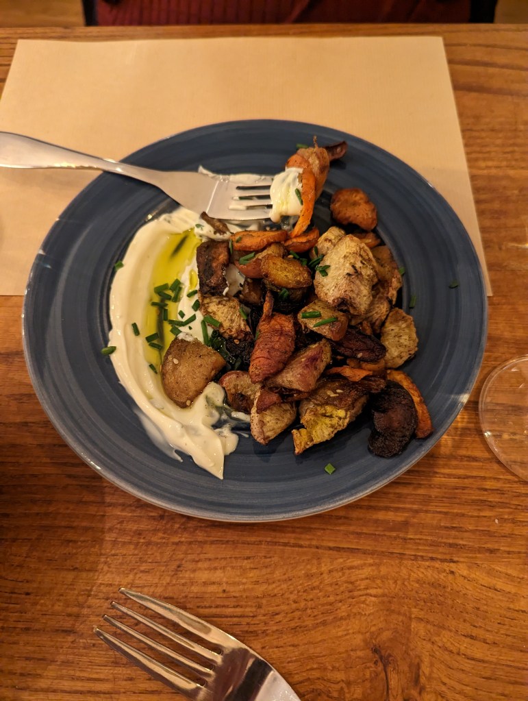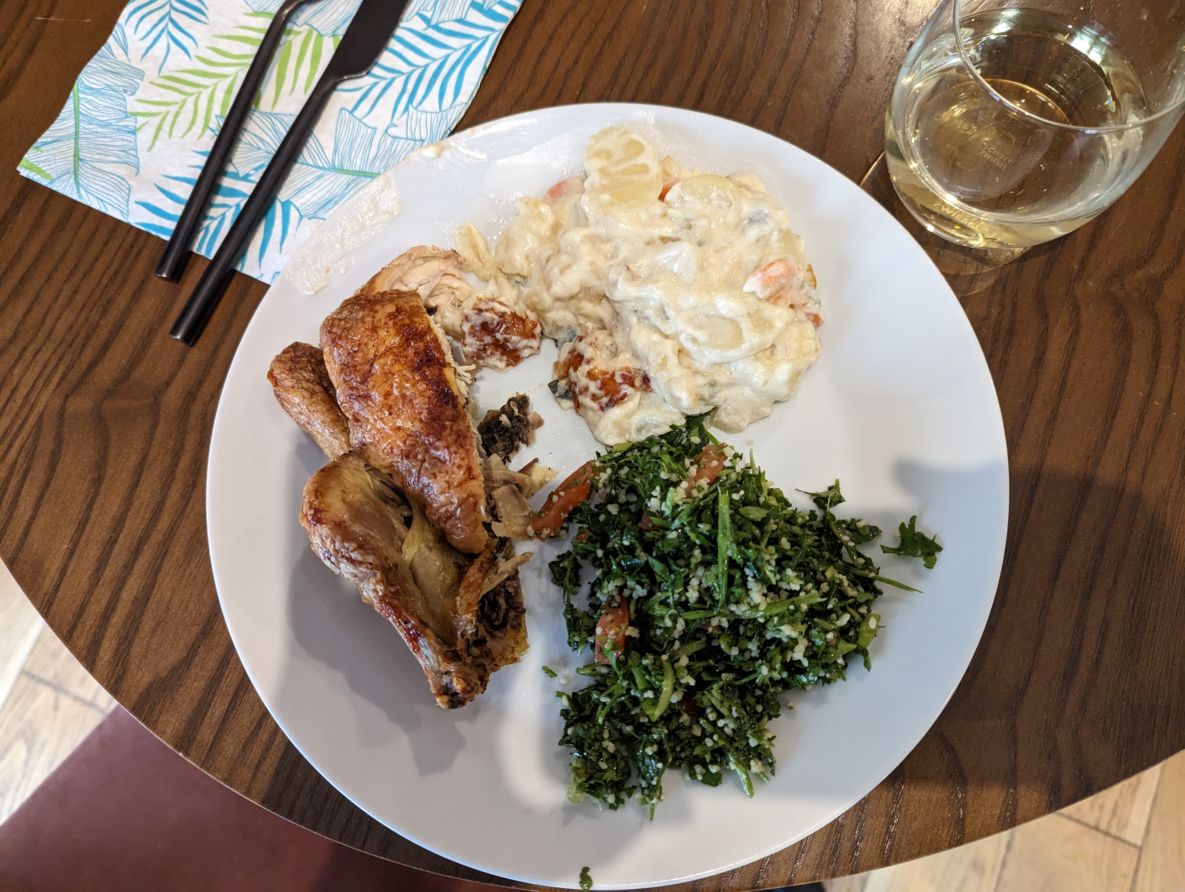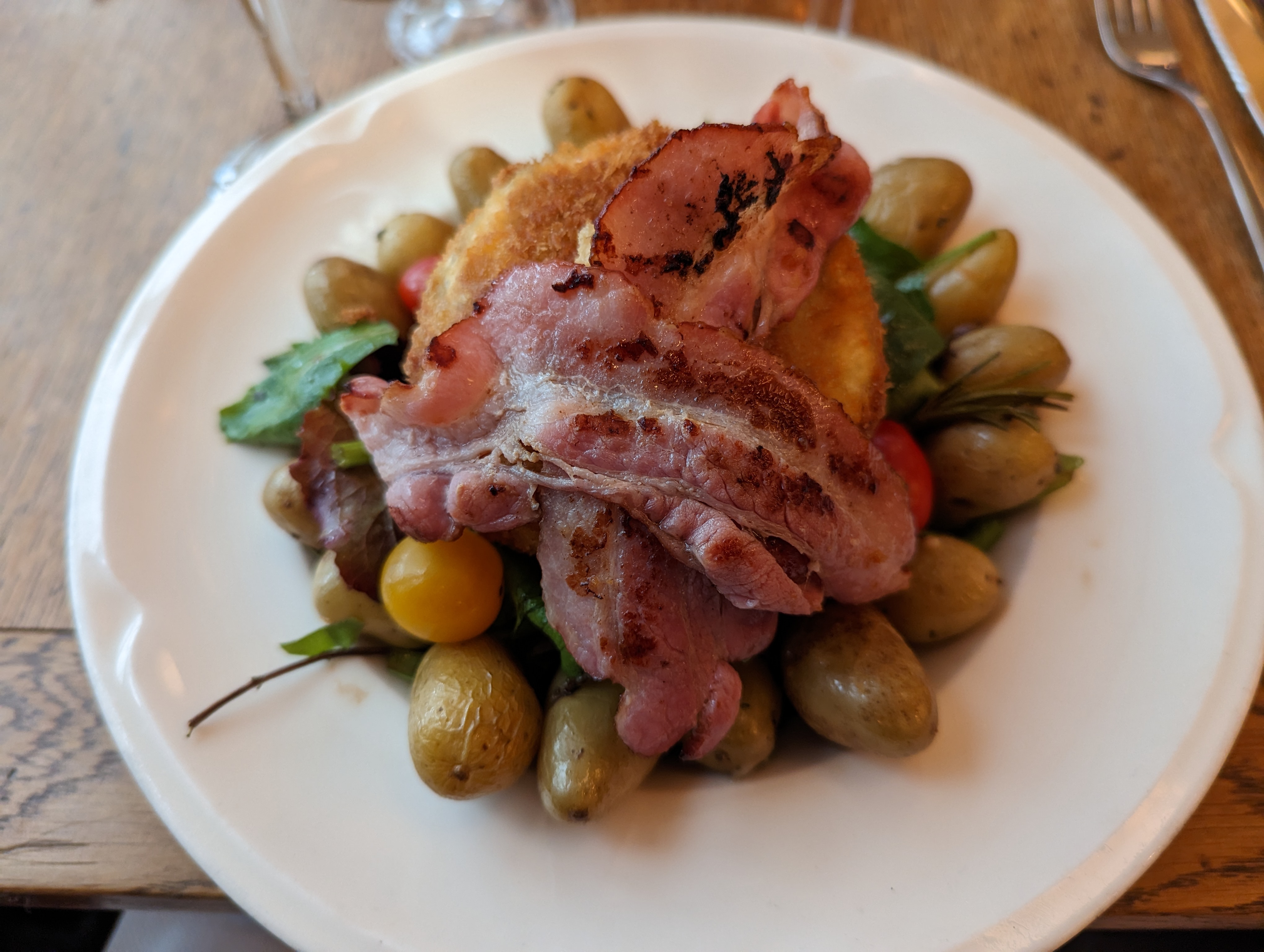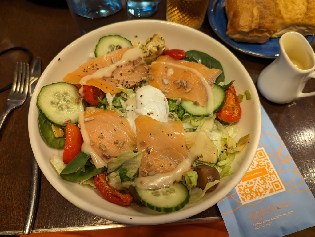 Lunch was in the cafe and hit the spot. A salad for me with artichokes, salmon, a poached egg, candied cherry tomatoes (not really candied but more like cooked down), and pickled onions. Plus a simple dressing that was quintessentially French and just delicious.