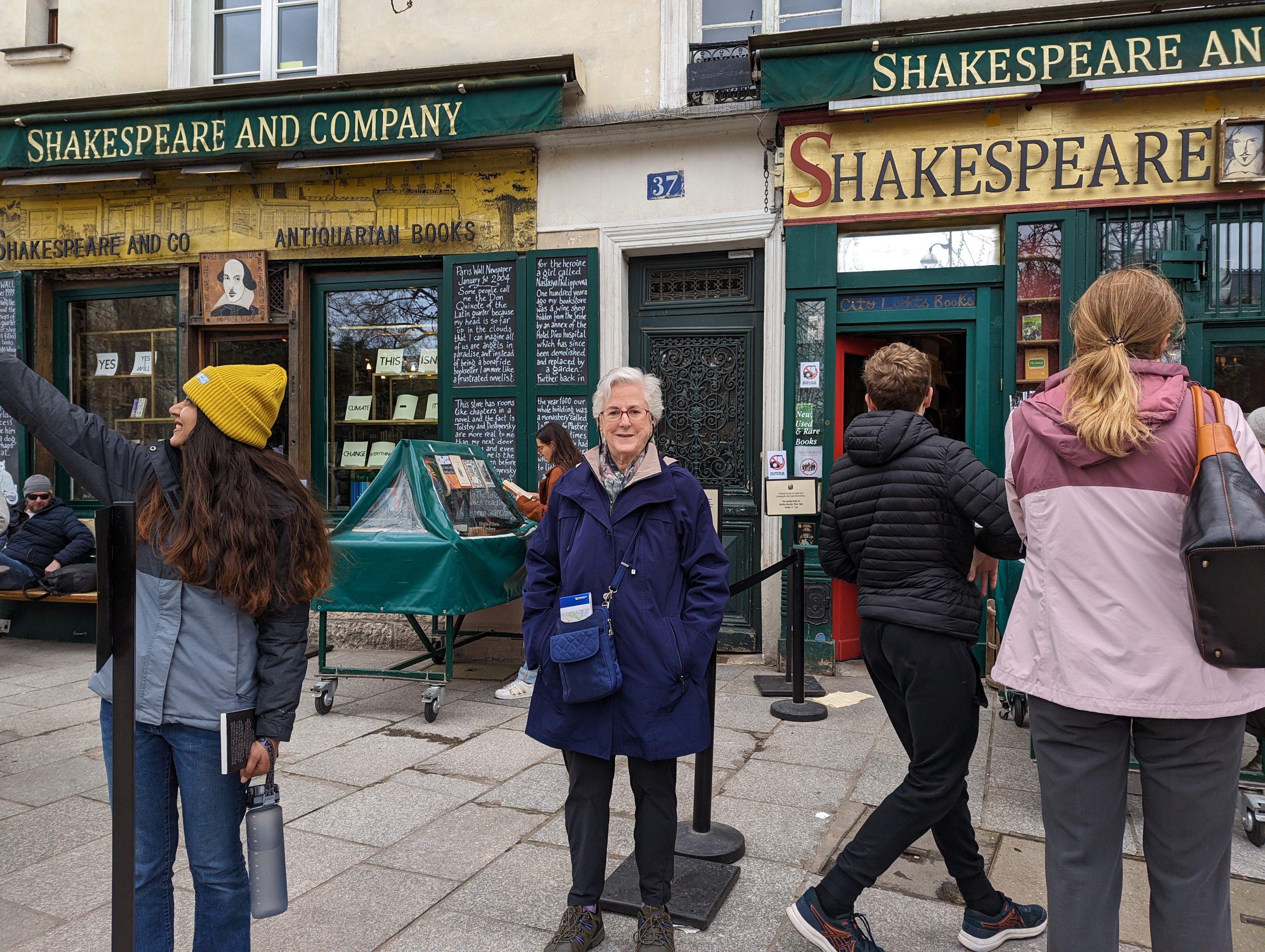 Across the Seine we found an elegant little cafe, almost deserted at 11 a.m., where we had expensive orange juice, tea and a croissant. We strolled by the bouquinistes and on to Shakespeare & Company, the English language bookstore founded by Sylvia Beach in 1919, frequented by every writer you’ve ever heard of. It’s now so popular that they actually limit the number of people who can be inside at the same time.
