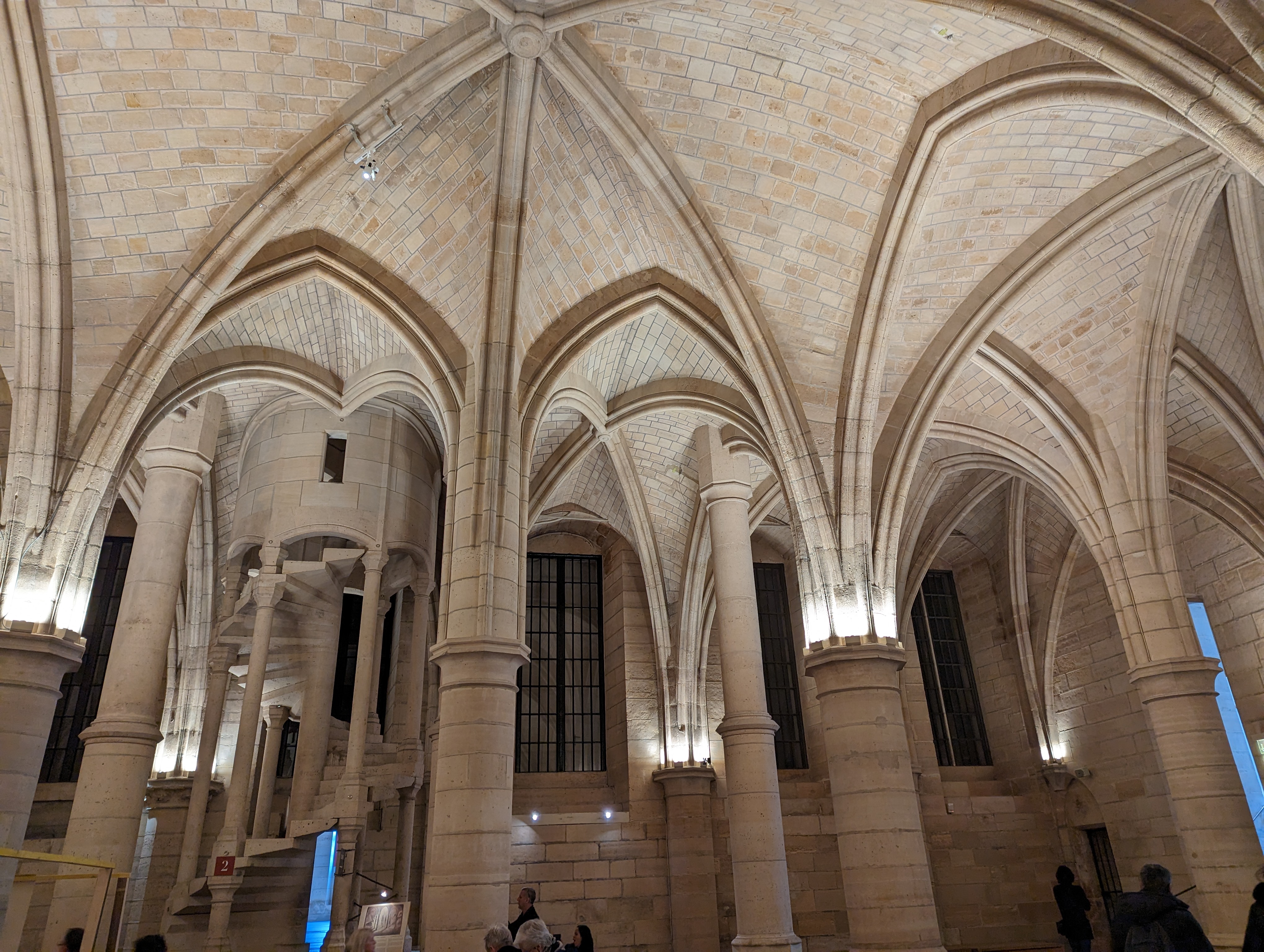 We stopped by Ste Chappelle to check out the lines (still long) and realized that the Conciergerie, where Marie Antoinette was jailed, was right next door with immediate entry, so we went on in. They are using technology to show you what the building would have looked like back then, so as you move your tablet around, you see fires flickering, view the uncomfortable beds, and hear people walking by. Not entirely successful, but interesting. It turns out Marie was there for only a few months, while thousands of other people spent more time there, so they sort of downplay her presence. But look at this striking Gothic ceiling!