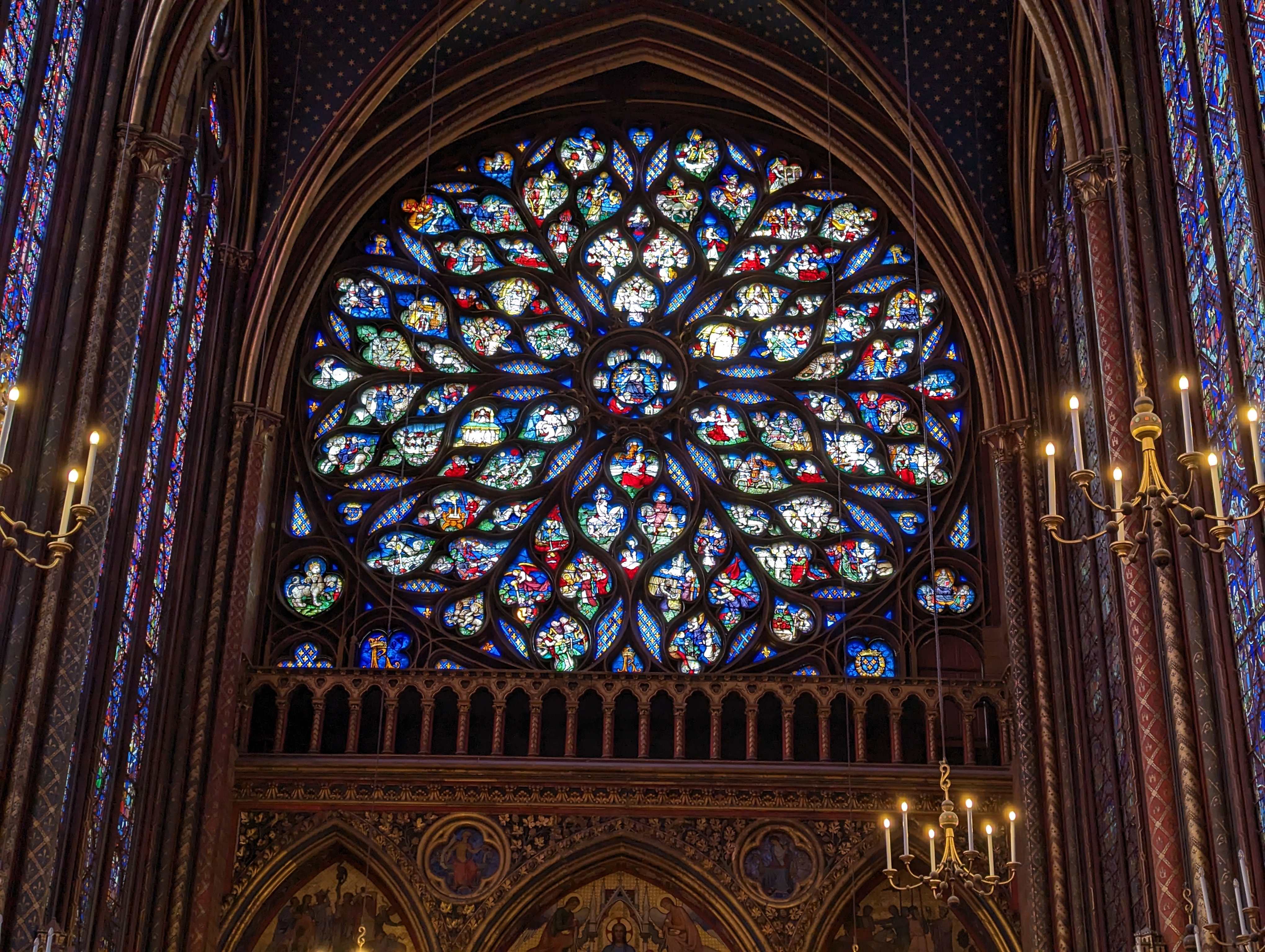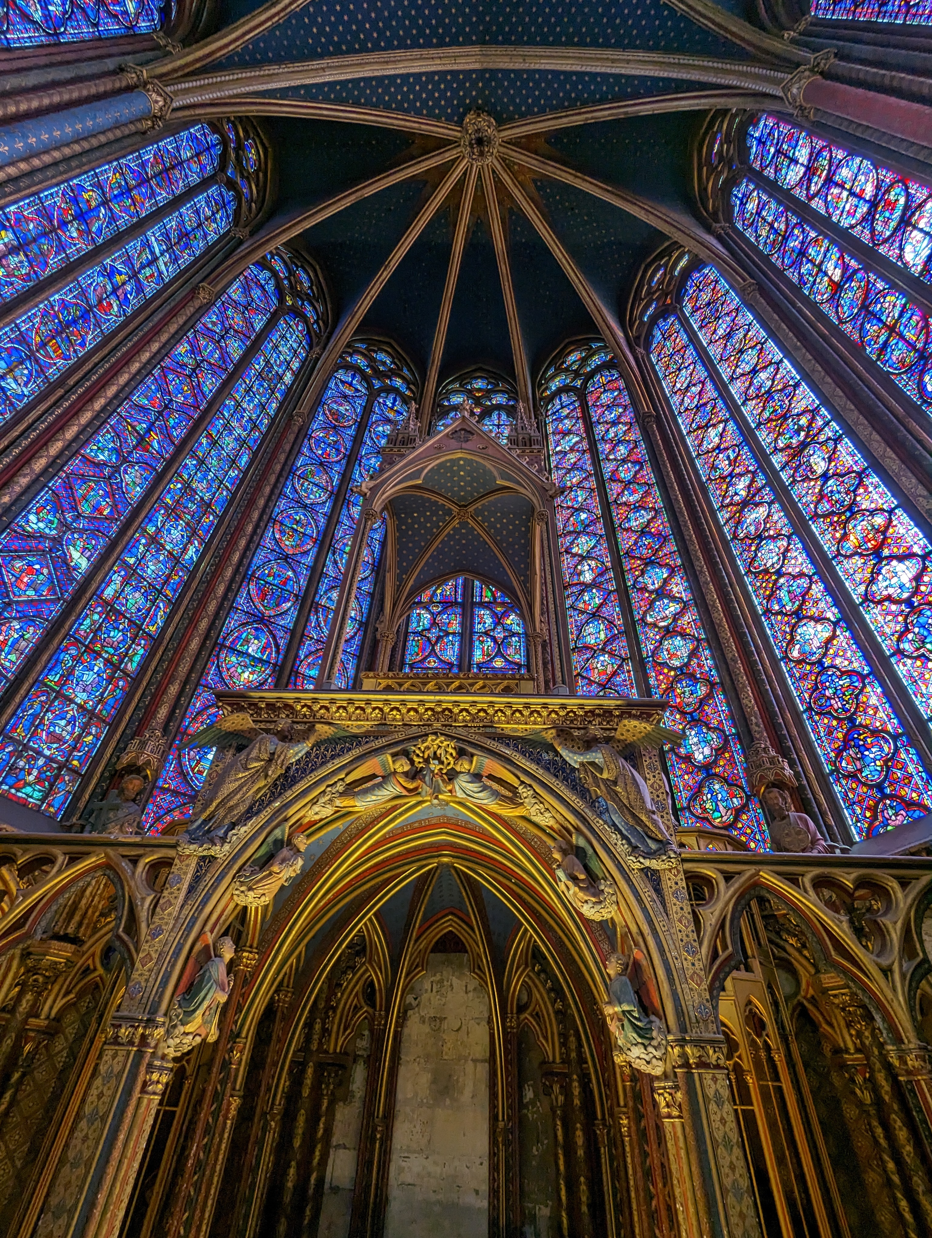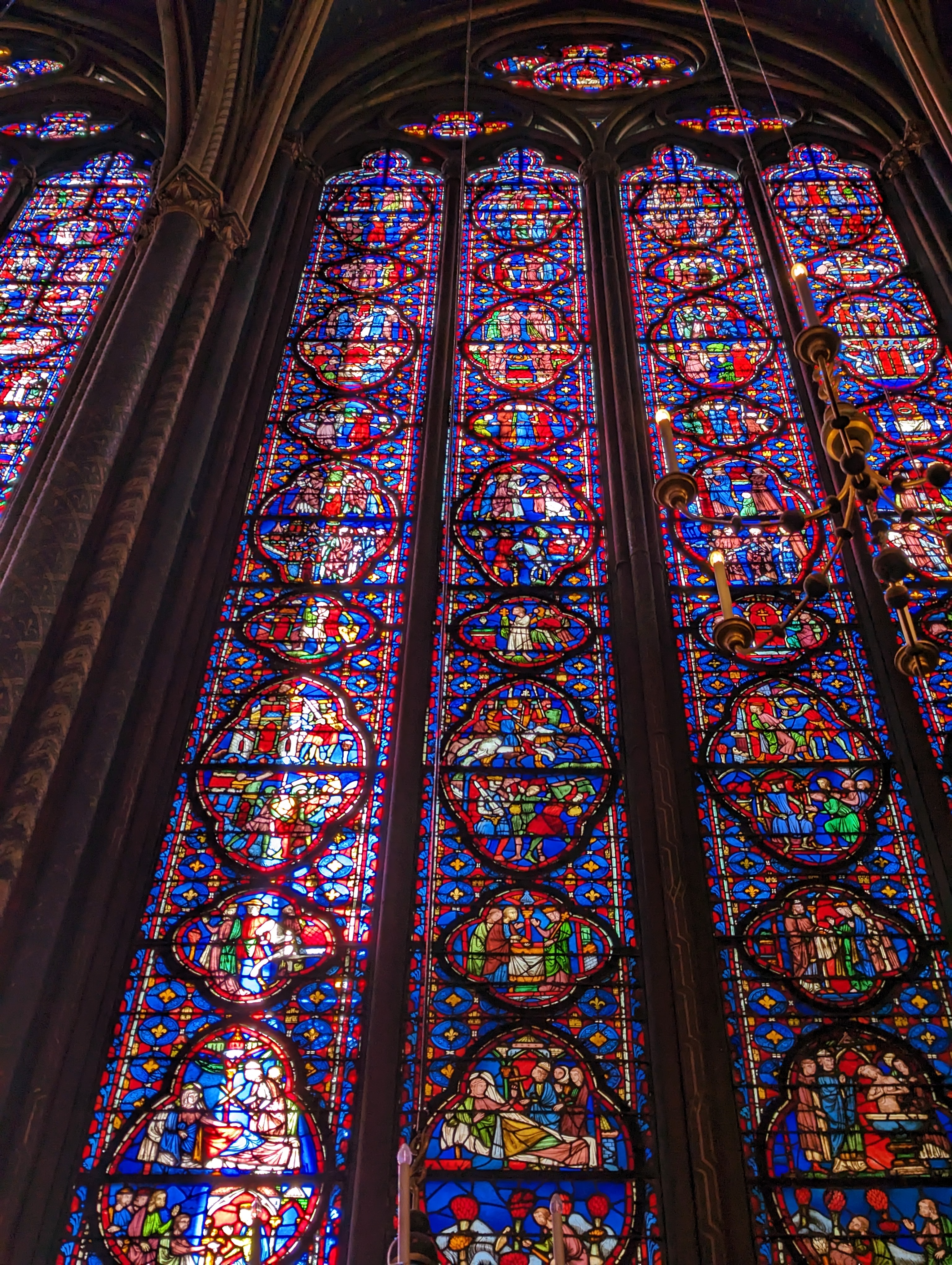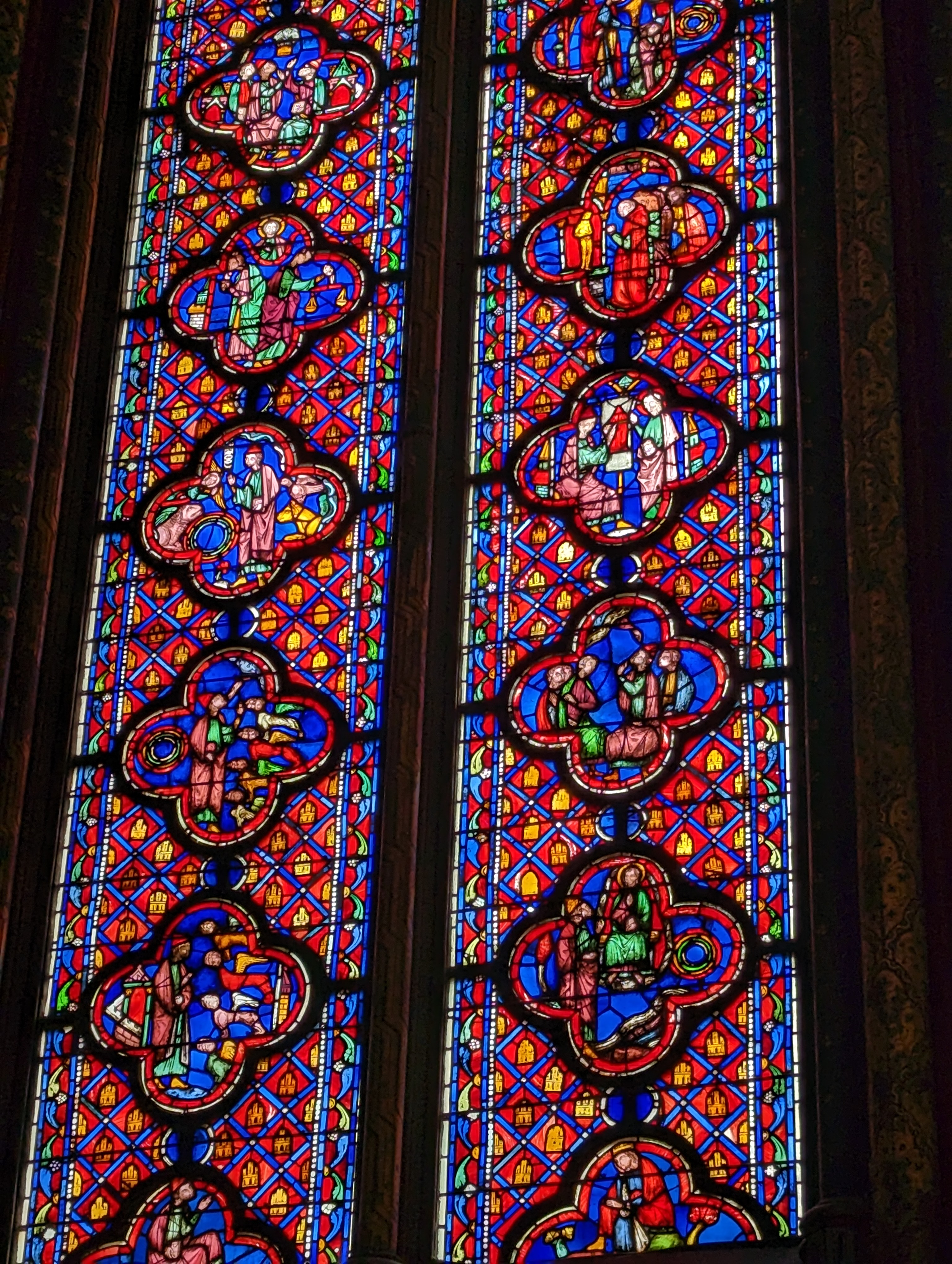 Today was cloudy, then brightly sunny, then cloudy again and then, while we were standing in line, raining hard for about five minutes. And of course you want to see the stained glass in good light. Well, we had enough sun to point out the contrast between light and shade, so that was fine, not to say occasionally brilliant. The intense blue, gold and red are so stunning that I couldn’t stop taking pictures.