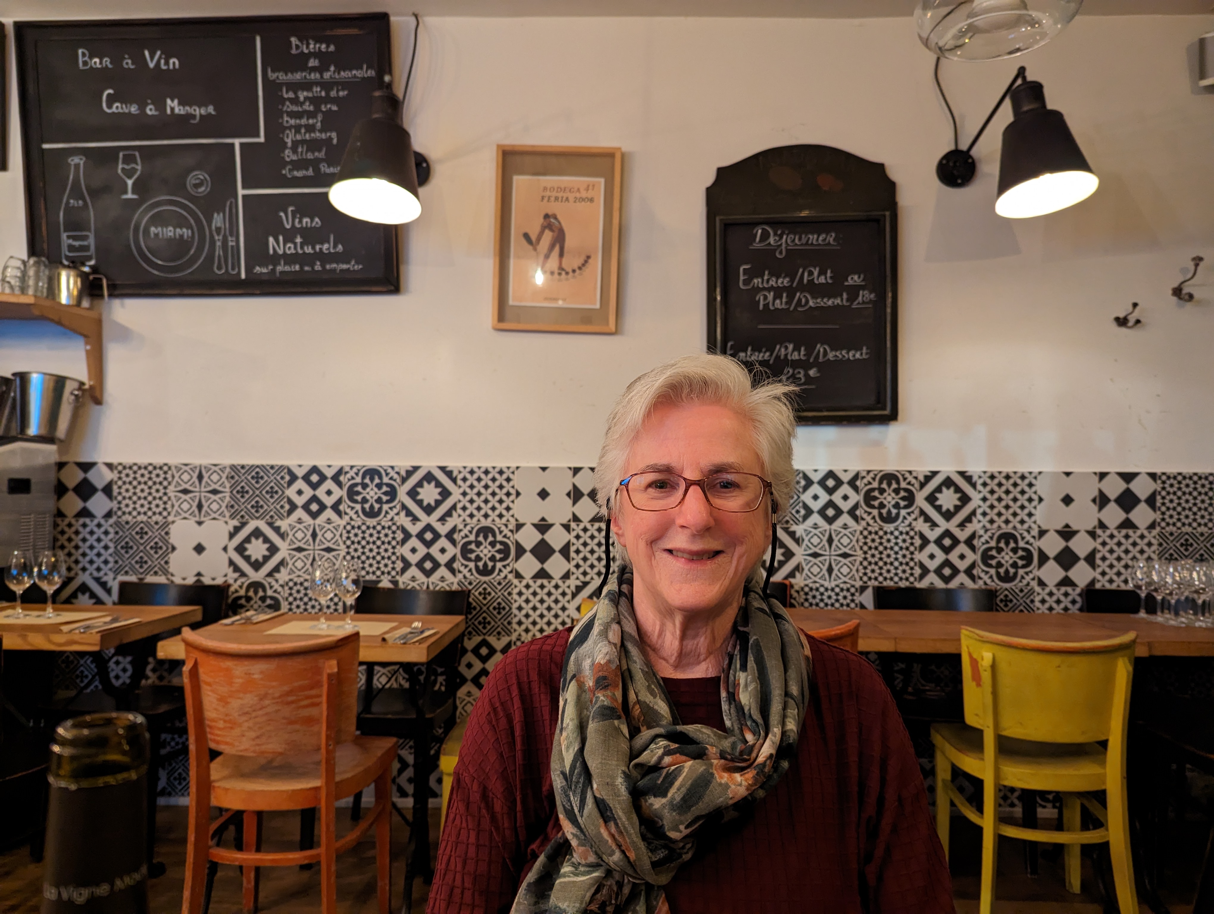 Dinner tonight was back in the Montorgueil neighborhood, with its rows of restaurants, food stores and wine shops. We had another good dinner – mine was salmon and green beans, which does not in any way convey how delicious it was.