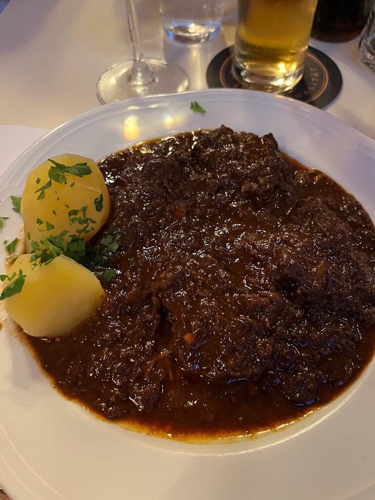 He showed us how everything worked – coffee maker, keys, wifi, etc. – and left us to our own devices. We were really beat but needed some food so we stopped by Billa, the local grocery chain, to pick up a few necessities (coffee pods, wine, yogurt, etc.). We then wandered along one of the streets in search of food and found a wonderful pub-like restaurant, where a delicious bowl of goulash and crusty bread (and wine) restored us.