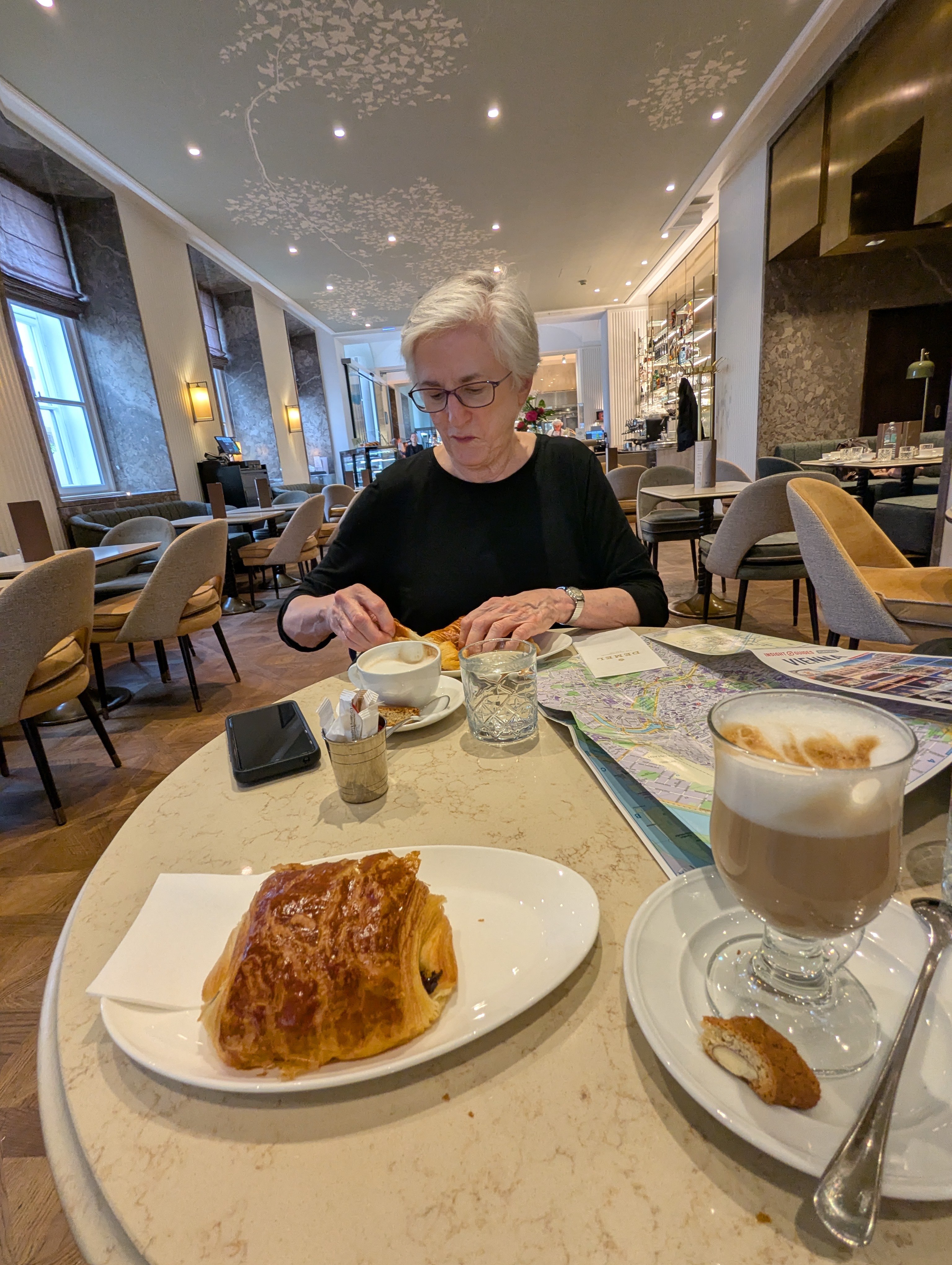 Our first stop was the Albertina, an art museum that also houses a branch of Demel, “Home of the finest cakes, chocolates and sweets in the heart of Vienna.” Here we are enjoying a little pastry and coffee in the best Viennese tradition.