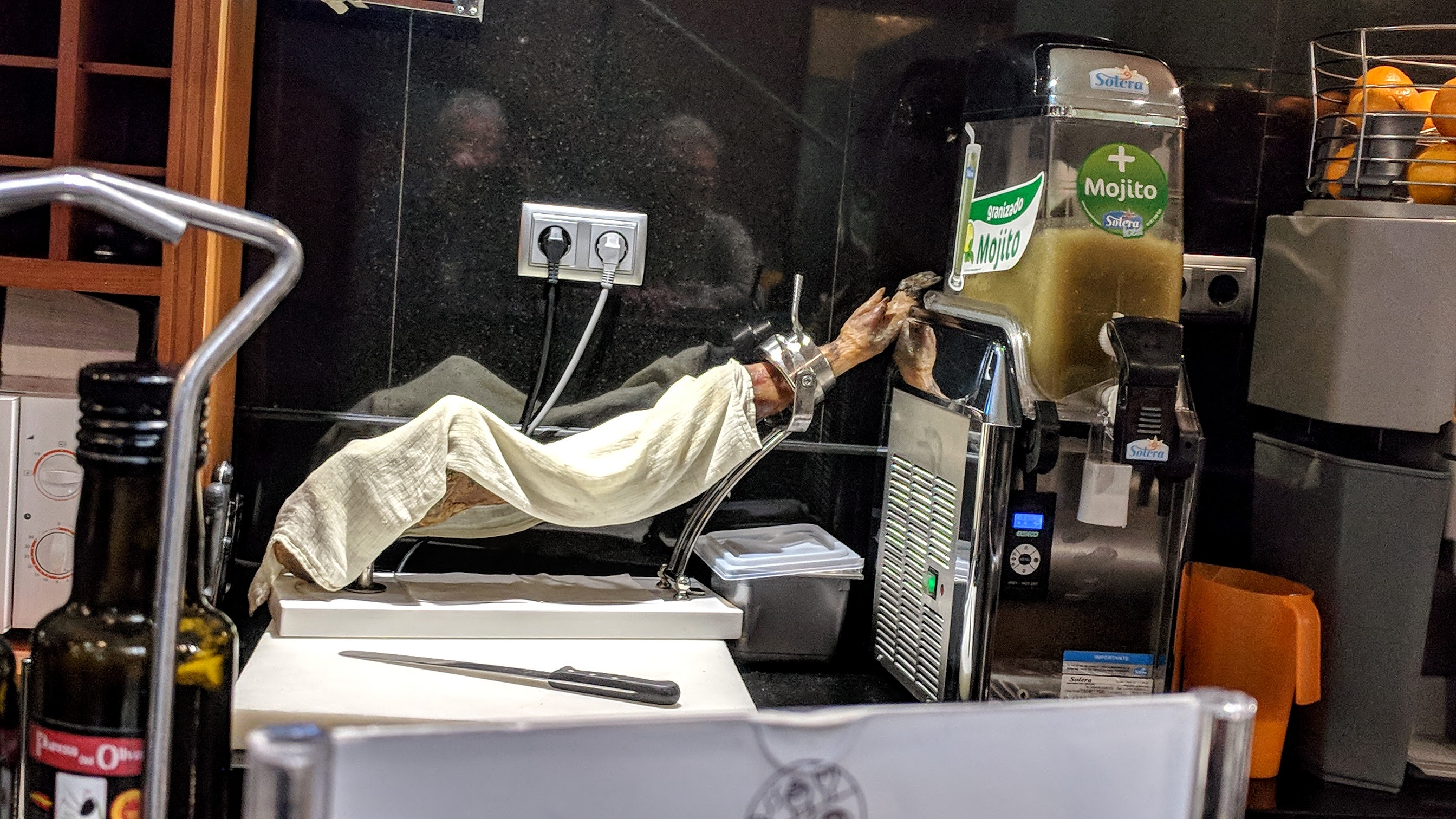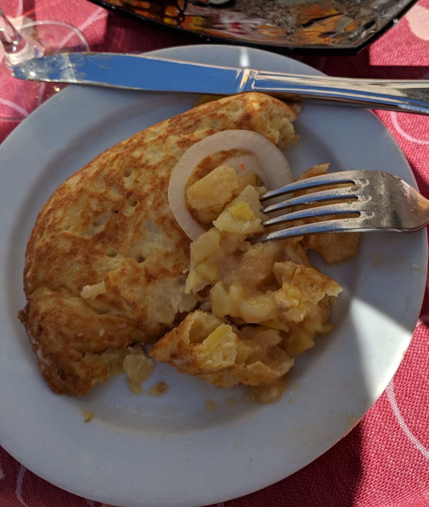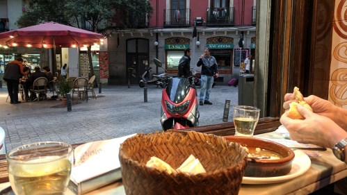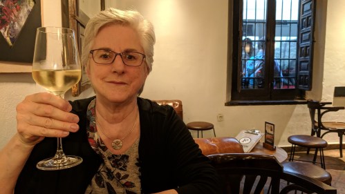 Dinner tonight was at La Fontana, a tapas place just around the corner from our hotel, facing the Rio Darro. We are still tapas novices, as evidenced by our behavior: we ordered wine and a hummus tapa to start and were surprised to see two little containers of couscous arrive. We tried to take it back only to learn that this was the tapa libre! Lo siento!! It was delicious, as was the hummus we ordered. All the tapas here were so good that, even though the waitrons as aways do not like to deliver the bill, to Alison’s frustration, we vowed to return tomorrow.