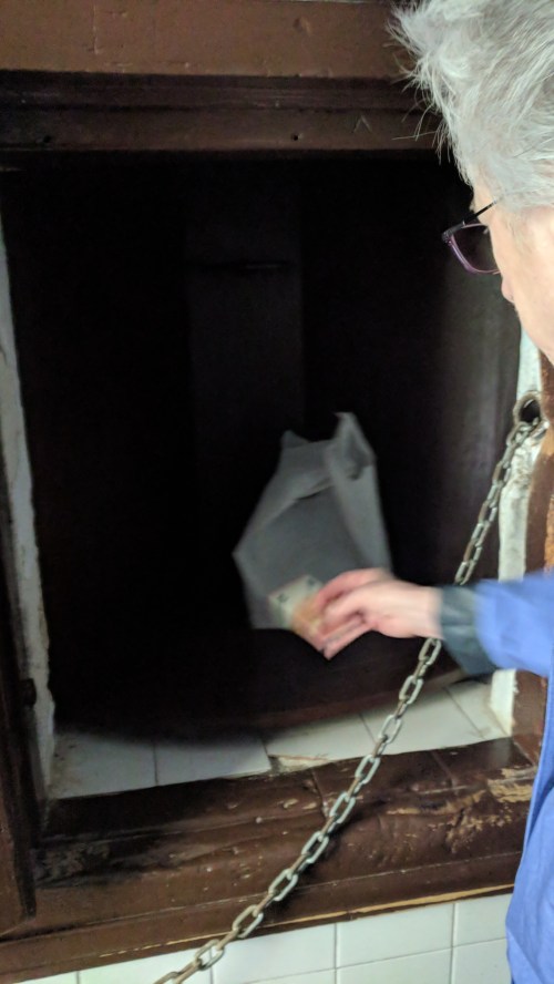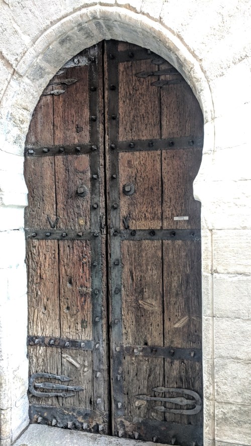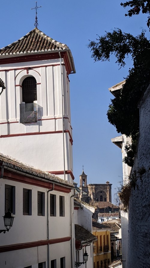 There is so much to see, and we have so little fluency in Spanish, that we have booked lots of tours on this trip. Too many? Time will tell. Today we started off with a walking tour of the lower Albaicin (another World Heritage Site on the list!) and the old city with Senna, a delightful young Belgian with impeccable English and what sounded to me like a perfect Spanish accent. He began by explaining the history of the Muslims in Spain and pointed out that, as I have discovered, if you are a progressive you tend to think that the three religions coexisted happily, and if you’re a conservative, not. He led us up steep streets lined with shops just like in Morocco, offering leather, textiles, jewelry, etc. We stopped at the top of a hill at a Catholic church run by the Clare Sisters, who pray unceasingly. And indeed we saw a white-clad figure, immovable in front of the altar, and a similar figure took her place as we watched.