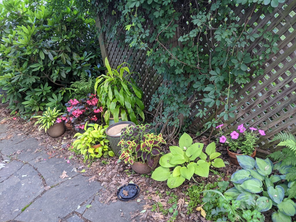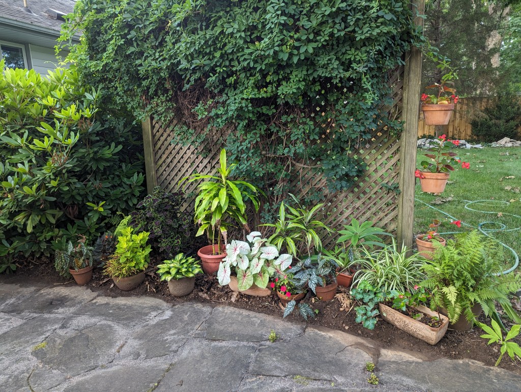 And the grading that prompted this whole thing looks very nice. The sewer people had uprooted the yews that grew against this wall, and I didn’t replant them. The rhododendron that I planted last year up and expired, though I have high hopes that a new one will have a better chance to staying alive.