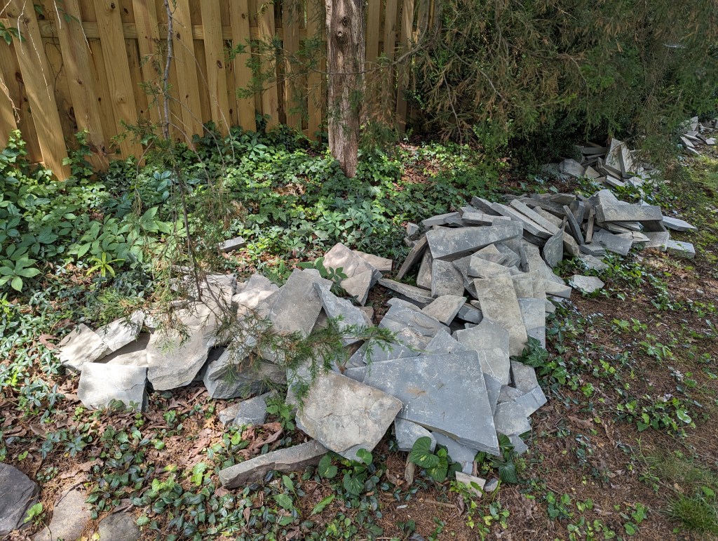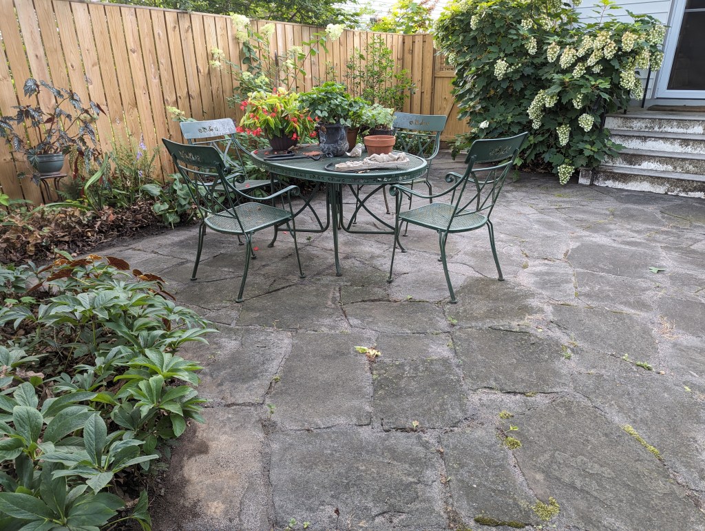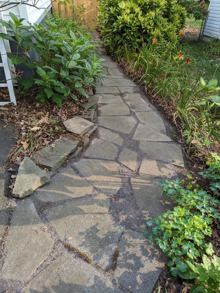 It’s well past time to fix the mess the sewer replacement people left behind, so to that end I called Meadows Farms to see what they could do. Well, not only could they regrade the spot by the front steps, but they could also (unrelated to the sewer business) redo the terrace with polymeric sand. This mysterious substance binds the stones together in some magic way, and ten+ years (maybe 15?) after the original installation, it was time to do it again. Oh, and they could also deliver some stones to replace the ones that disappeared during the sewer mess.