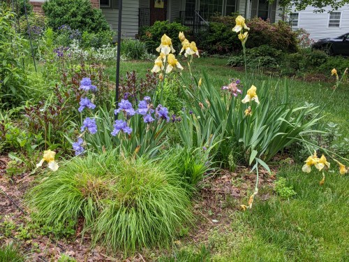 Spring brought some lovely blooms. The irises, which I sometimes despair of because this bed is so weedy, were lovely (if a bit floppy). I especially like the blue ones. Wish I still had the white ones I inherited from my mother, who got them from Bob Taylor decades ago. This was in mid-May.
