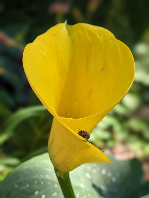 And here’s the gallant calla zantedeschia that came as a bonus bulb from McClure and Zimmerman several years ago. If I’d realized its scale, I wouldn’t have planted it so close to one of the lush hostas, but so it goes. It comes up faithfully every year.