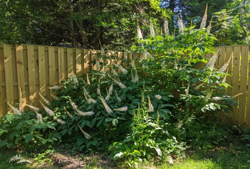 By the end of June (after the wedding, and English garden pictures to come), long, spiky blooms appeared on the bottlebrush buckeye. The butterflies love them.